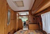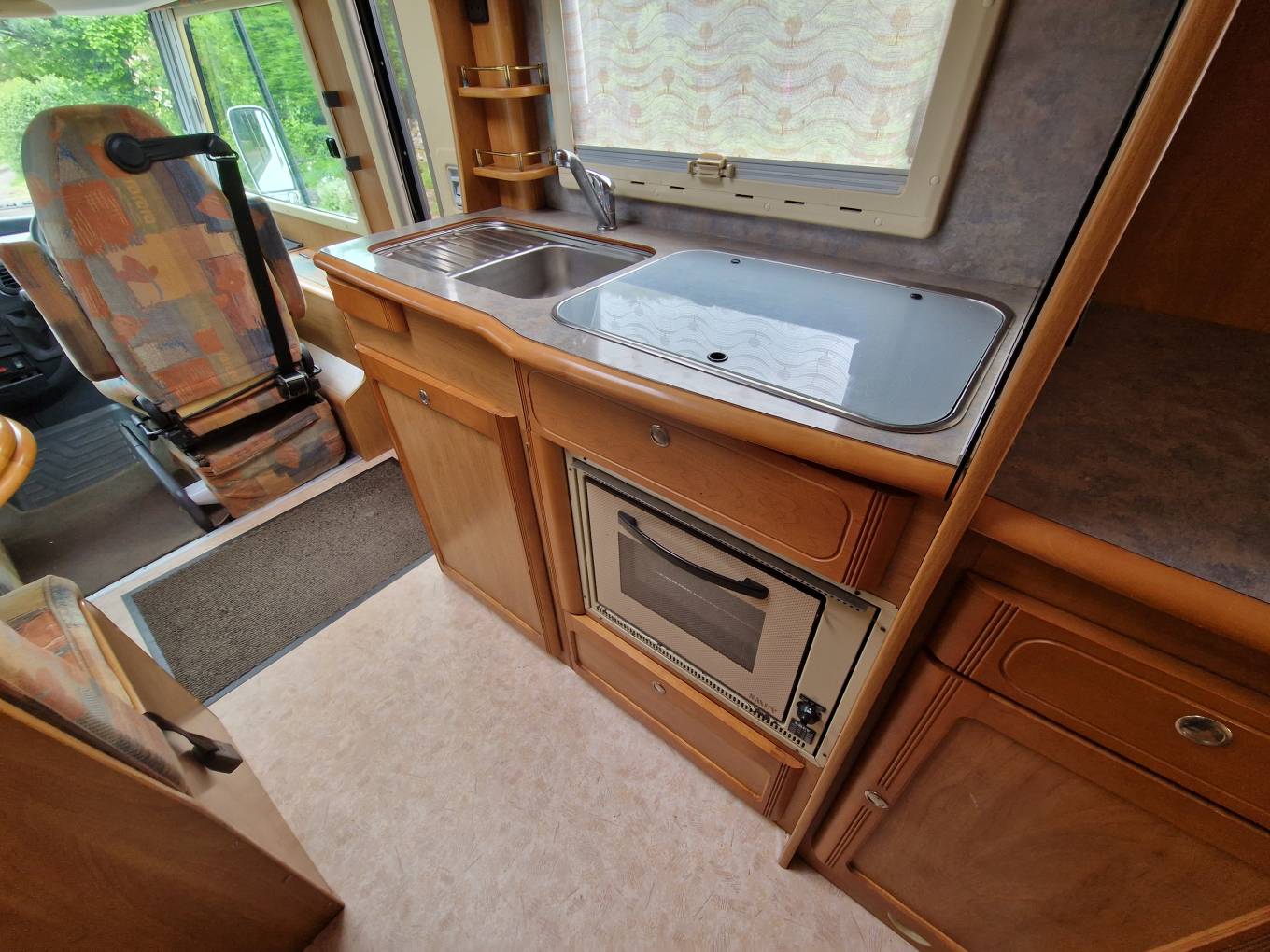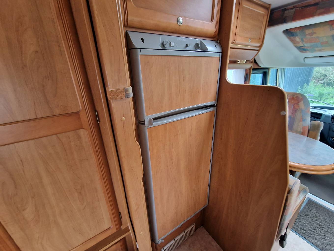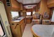 If you enjoy cooking on your travels you are well catered for as this motorhome has a 3 gas burner hob, a Smev gas oven and grill, a large Electrolux 3 way fridge freezer, a sink with mixer tap, a generous work top area and lots of cupboard and drawer space. Across on the other side is the dinette which has a large dining table which is perfect to enjoy meals or play games, and as both front seats are Captain chairs 4 people can dine in real comfort. Above the dinette is a large skylight which throws in loads of natural light which makes this a lovely spot to relax with a glass or two of the falling over juice.