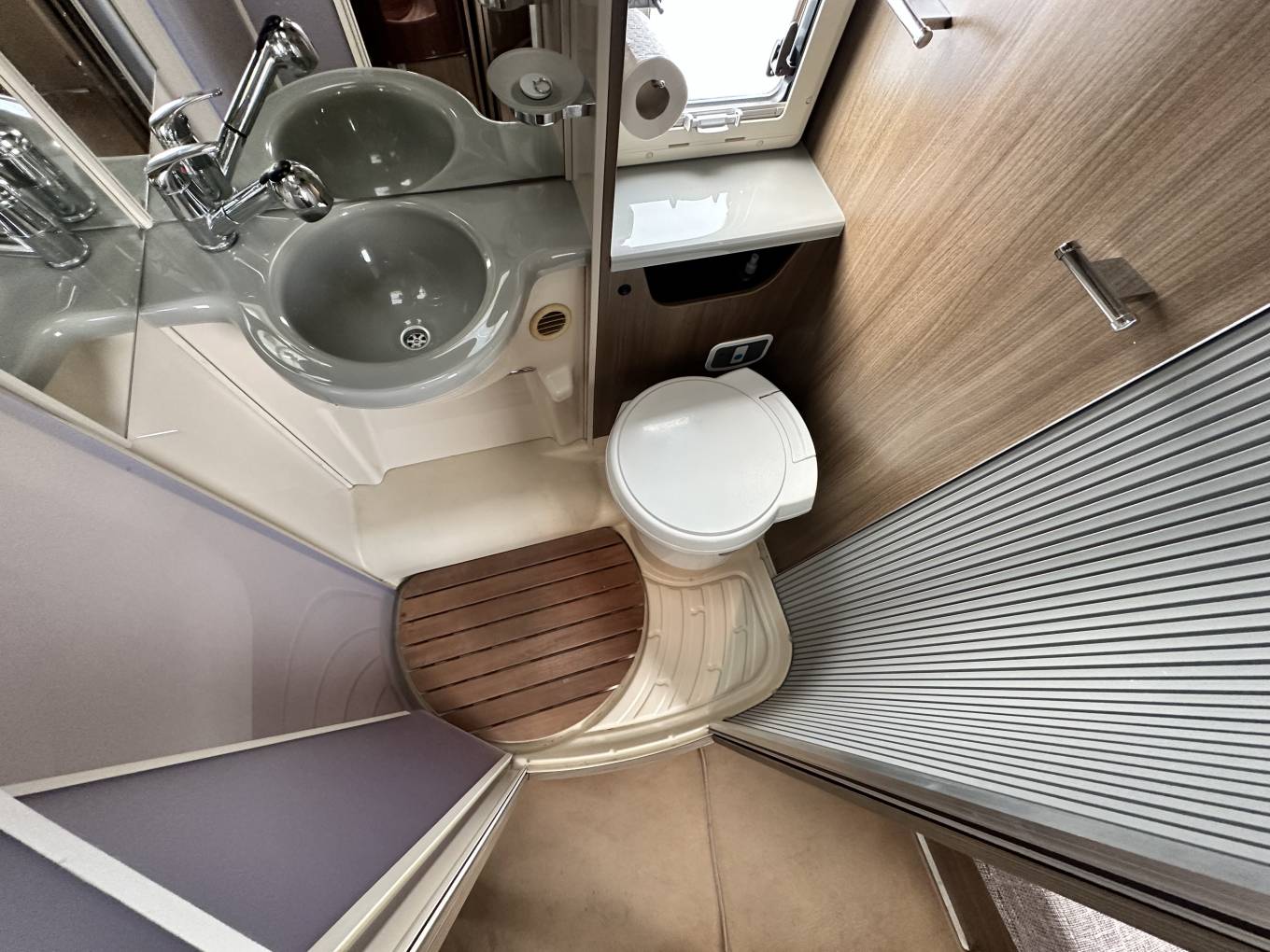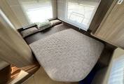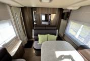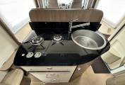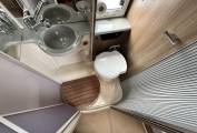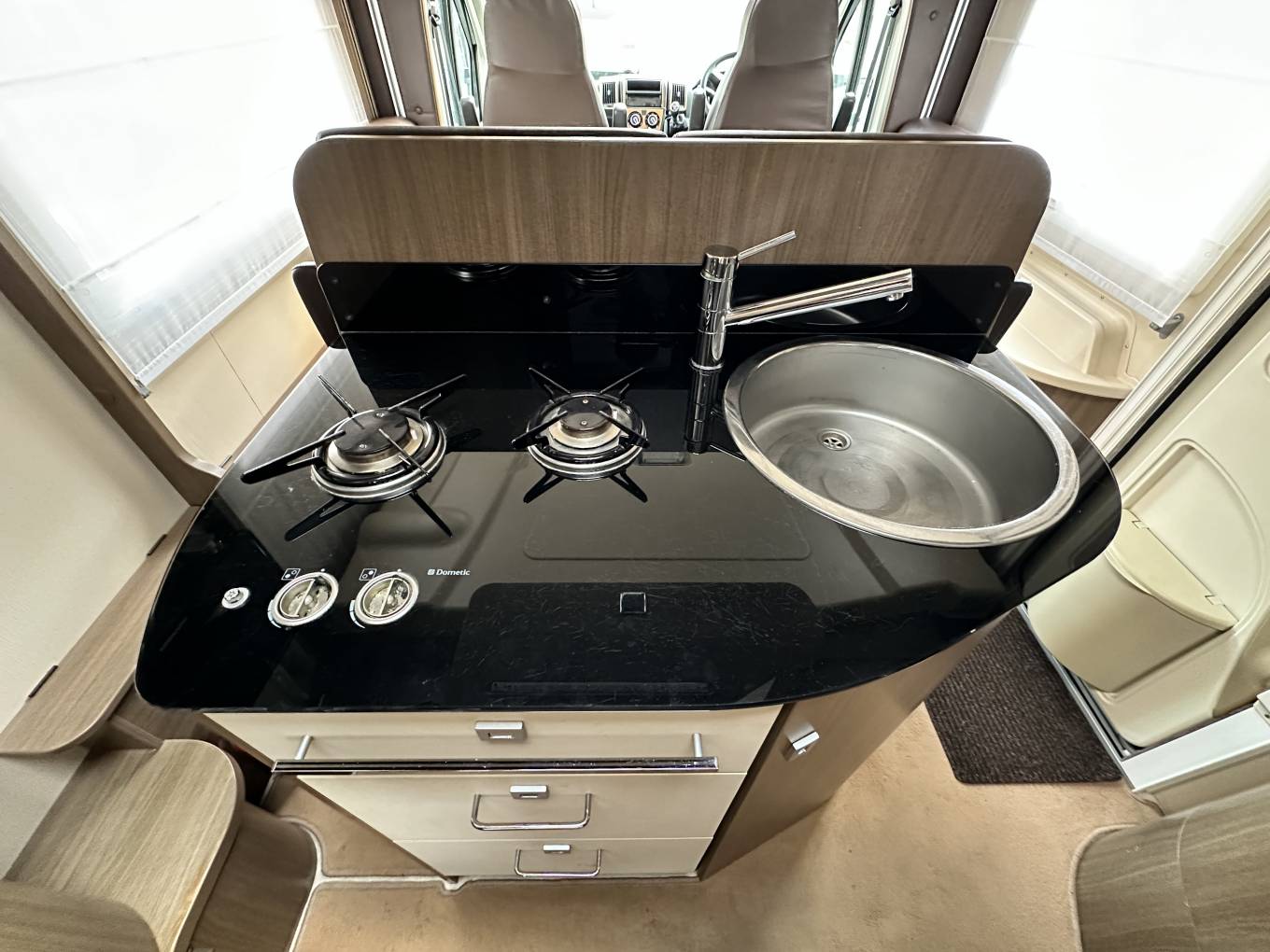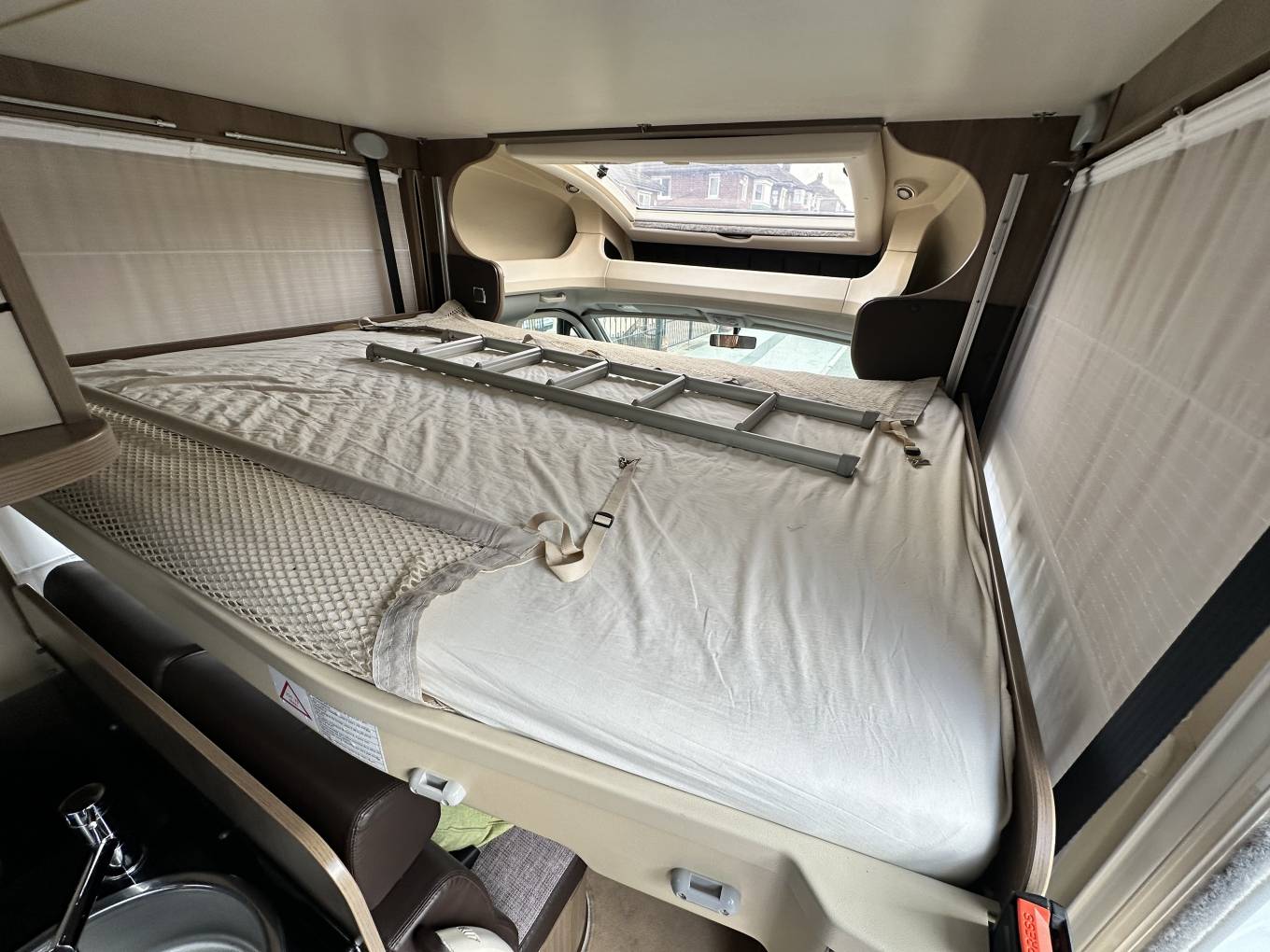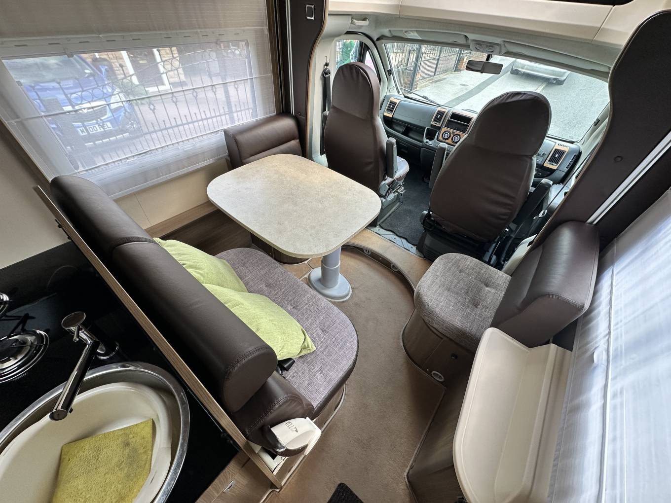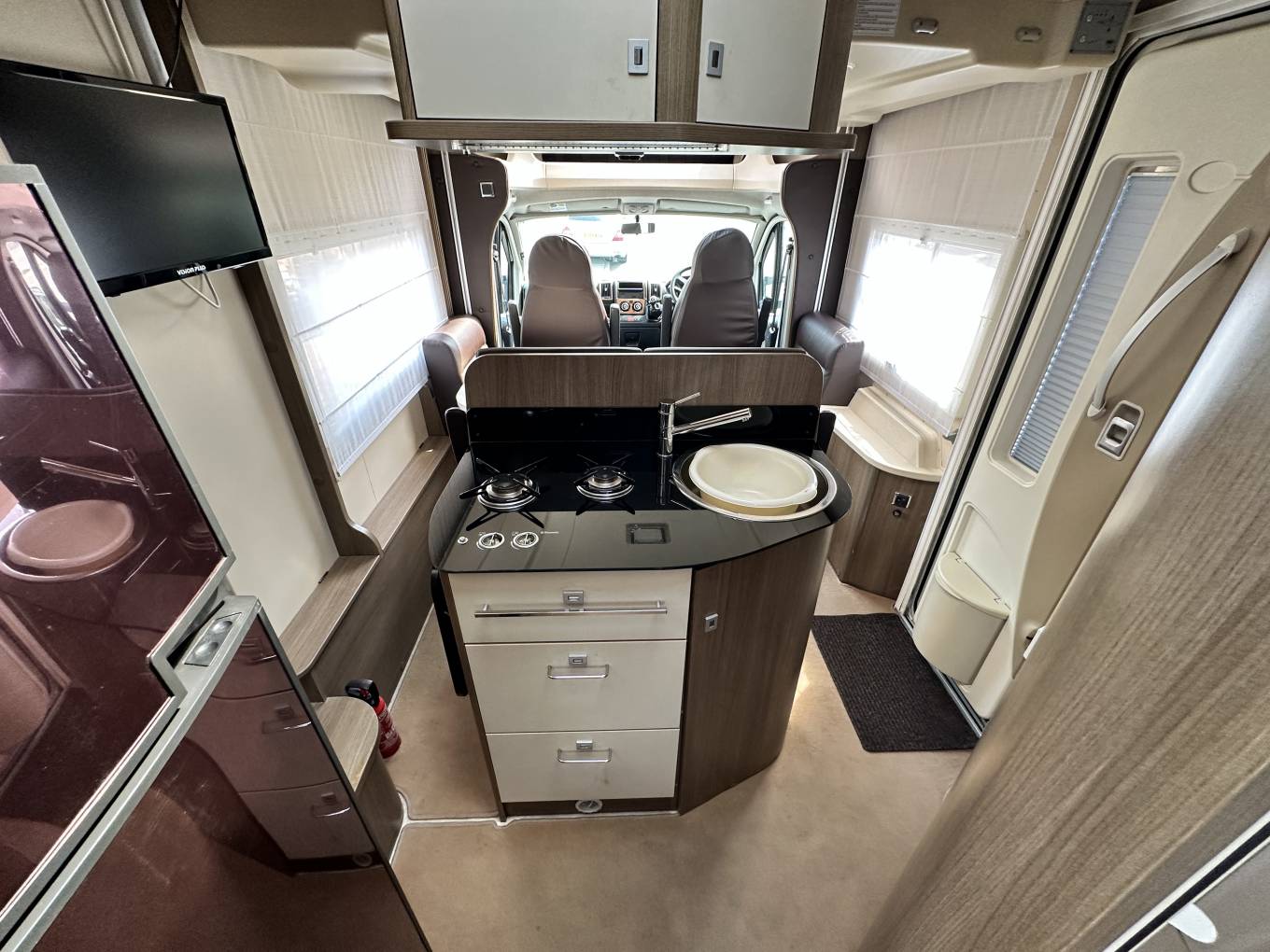This motorhome offers a no compromise layout with stacks of space and storage. Firstly, we start at the rear where you will find a huge, comfortable double bed with lots of storage around and below the bed. This space can also be closed off with a sliding door, giving the rear a cosy feel. Next, is the washroom complete with shower, toilet and wash basin. As we walk forward we arrive at the kitchen area which is a great space to prepare a meal and entertain. This area features an island with built in 2 ring gas hob, sink with mixer tap and storage. The kitchen also includes a large separate fridge freezer, a pantry, more storage and a grill. To the front is the dinette area, this seats 6 comfortably with the aid of 2 swivel seats and is the perfect place to relax and take in the surrounding views. When the night draws in, the double bed above drops down at the touch of a button.