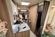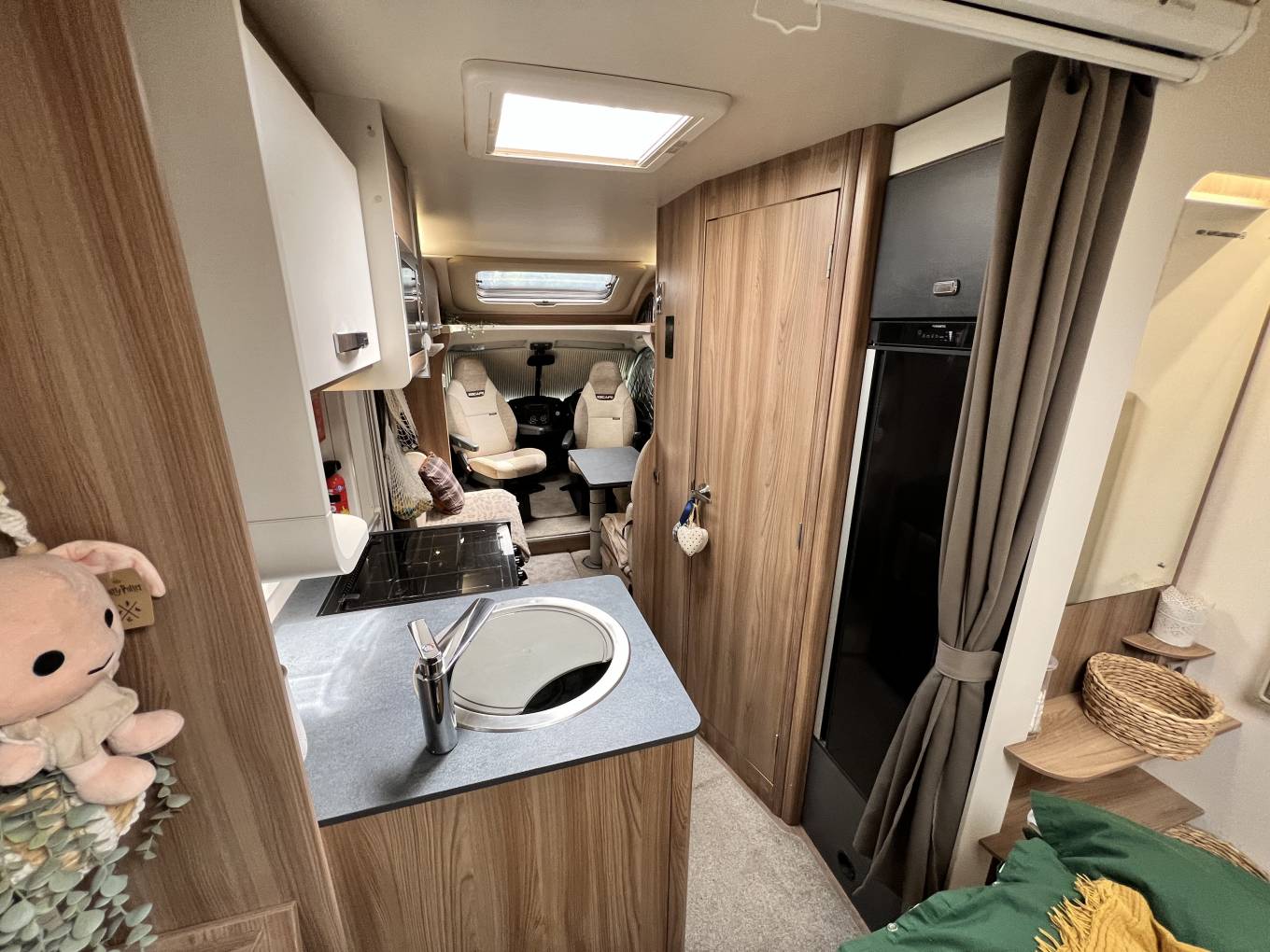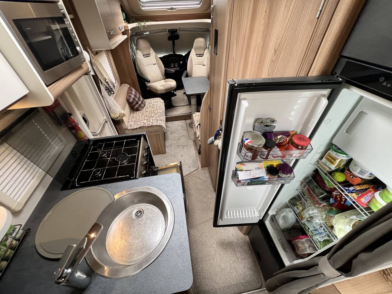 To the right as you enter is the kitchen where you will find a Three Burner Gas Hob, an Oven Grill combination, a sink with a Hot & Cold Mixer Tap, a Dometic Fridge Freezer, a Microwave Oven, plenty of cupboards and an extendable worktop.