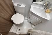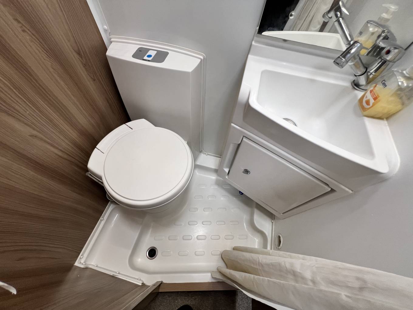 Opposite is the wetroom style bathroom with a Thetford Flush Cassette toilet, a Wash Handbasin and a Shower.