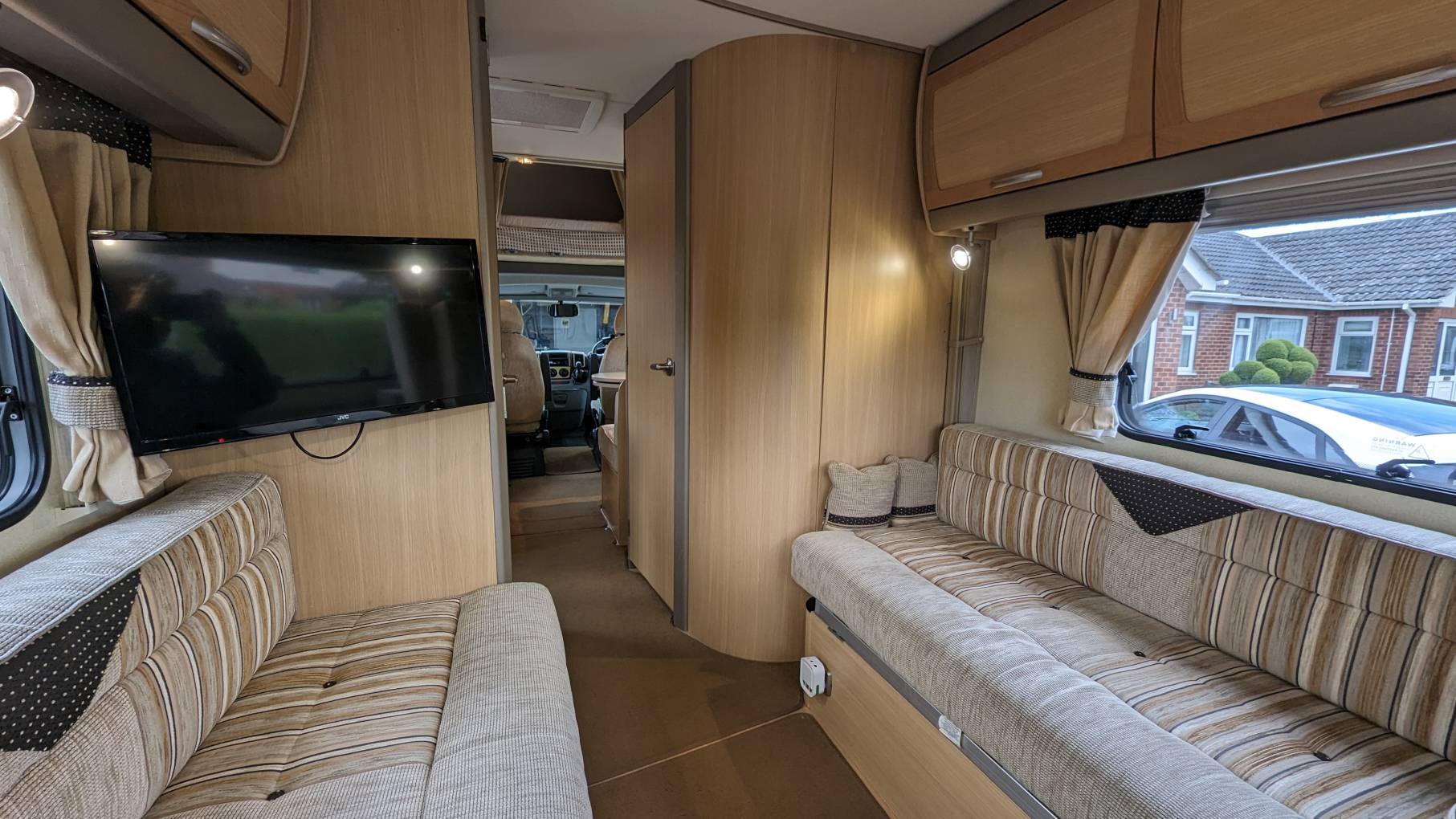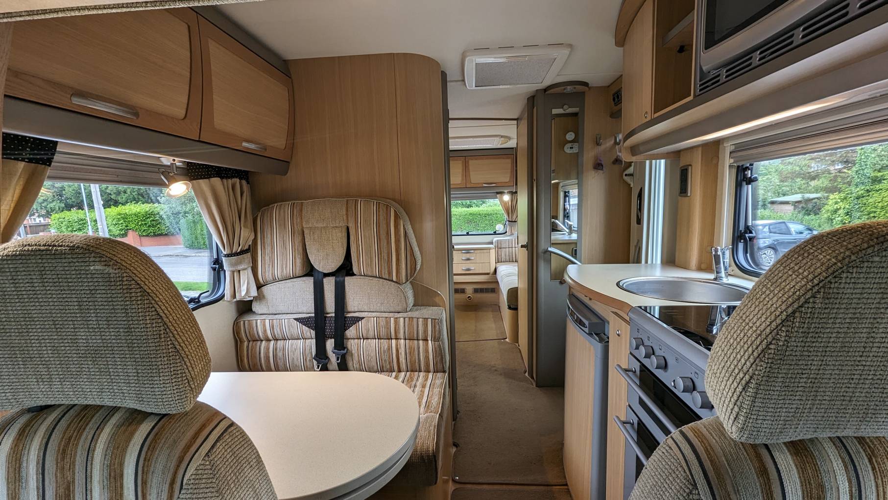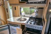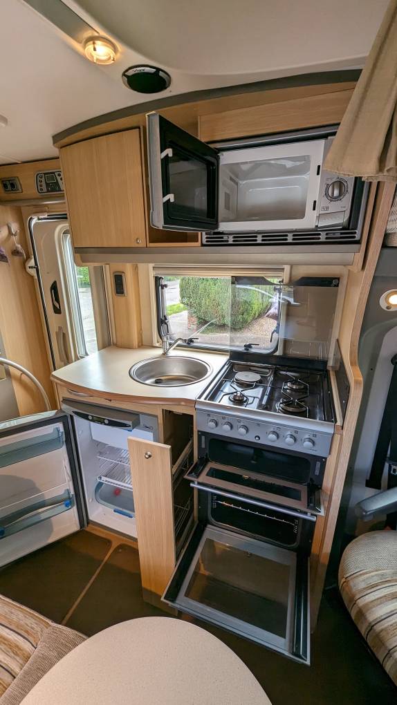 The well equipped front kitchen includes a gas hob, grill, oven, sink, mixer tap, microwave and a fridge with a freezer compartment. Everything you need to prepare meals on the go is at your fingertips.