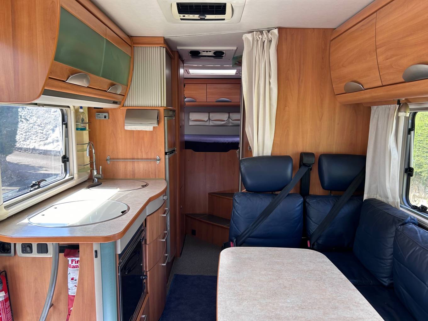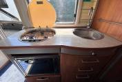 containing a stainless steel covered sink, a 3 burner gas hob & lid, a gas oven with grill, a large DOMETIC fridge(which very cleverly automatically selects to run on Gas,12v or Mains electricity as required) with separate freezer and plenty of prep and storage areas.