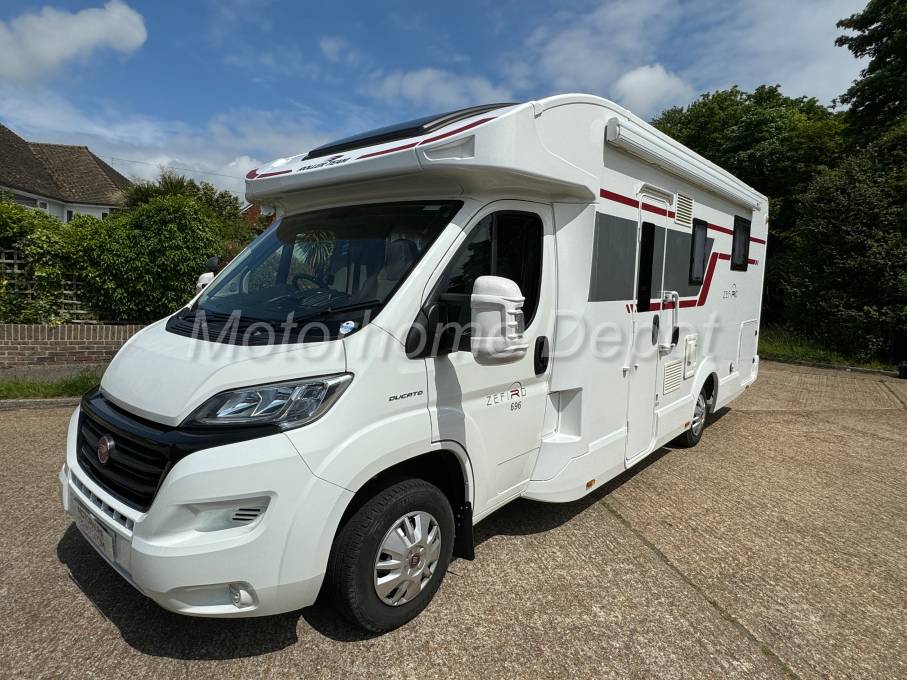 The Roller Team Zefiro 696 with the sought after rear island bed. Based on the ever popular Fiat Ducato chassis with the 2.3 litre multijet turbo diesel engine & comfortmatic 6 speed automatic gearbox in its 130PS engine. It comes with a good service history including 3 mechanical services the last including the cam belt kit in 03/24. 3 habitation services and a recent damp check 05/24. The cab benefits from: air conditioning; cruise control; central locking front; multi function steering wheel; hill descent, traction control plus; Pioneer Double Din head unit with Bluetooth phone and music streaming; electric adjustable & heated mirrors; electric windows front; reverse camera screen; remis blinds to front & side screens.