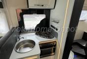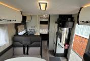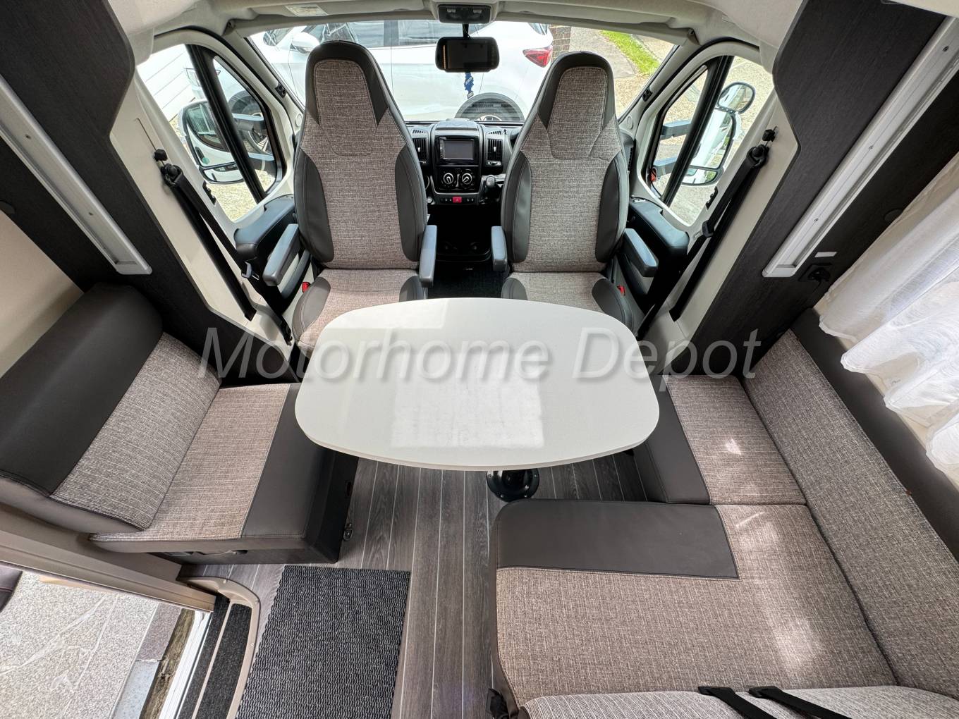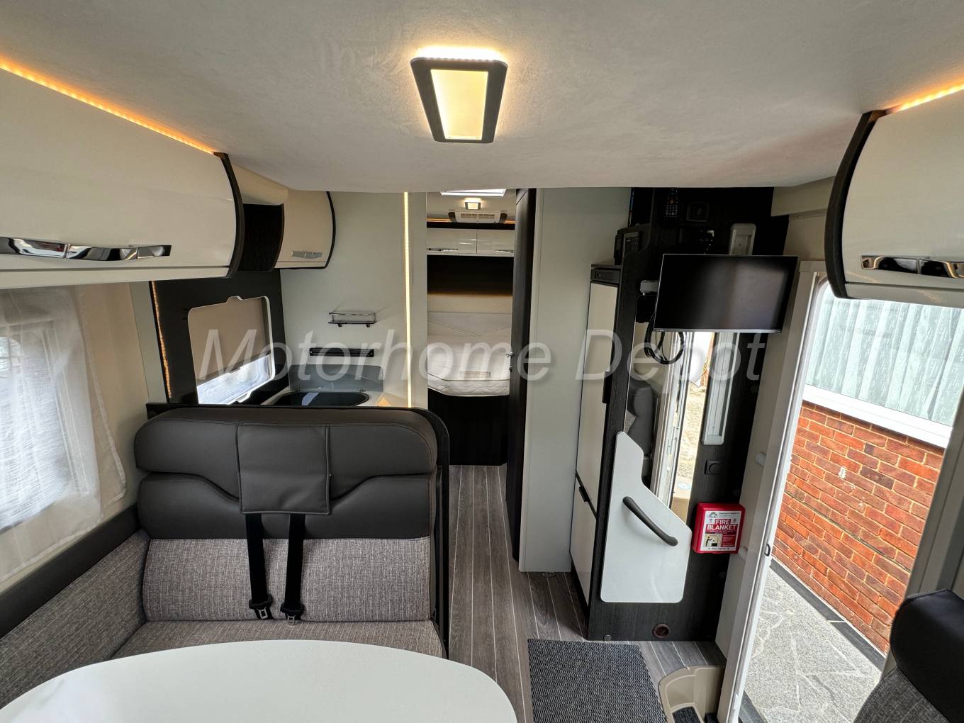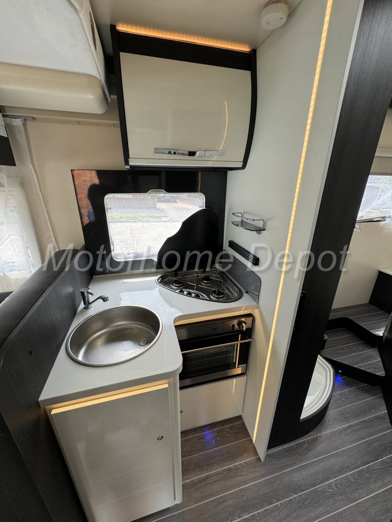 We enter the Motorhome on the passenger side via a low step, to the left of the habitation door is a single seat & opposite an L shaped sofa the forward facing part benefiting from 2 travelling seats with 2x3 point lap & diagonal seat belts. The table is centrally mounted and can be positioned in many axis. The front two seats rotate to join this area so you could easily seat 6 people around the table if entering on site. There is a TV point with Avtex flatscreen tv to the right of the habitation door.