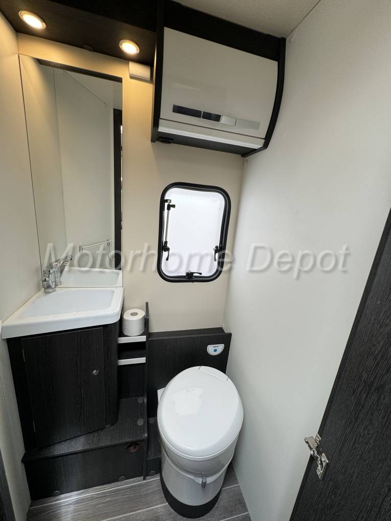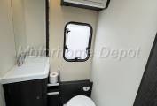 Moving rear is the bathroom area which is split across the full width of the motorhome. The toilet door can close across gangway giving a private area to get dressed in the morning. The washroom consists of Thetford cassette style fresh water flush toilet with swivel head; white corner sink above with chrome mixer tap. Opposite the separate shower cubicle with Perspex doors to close.