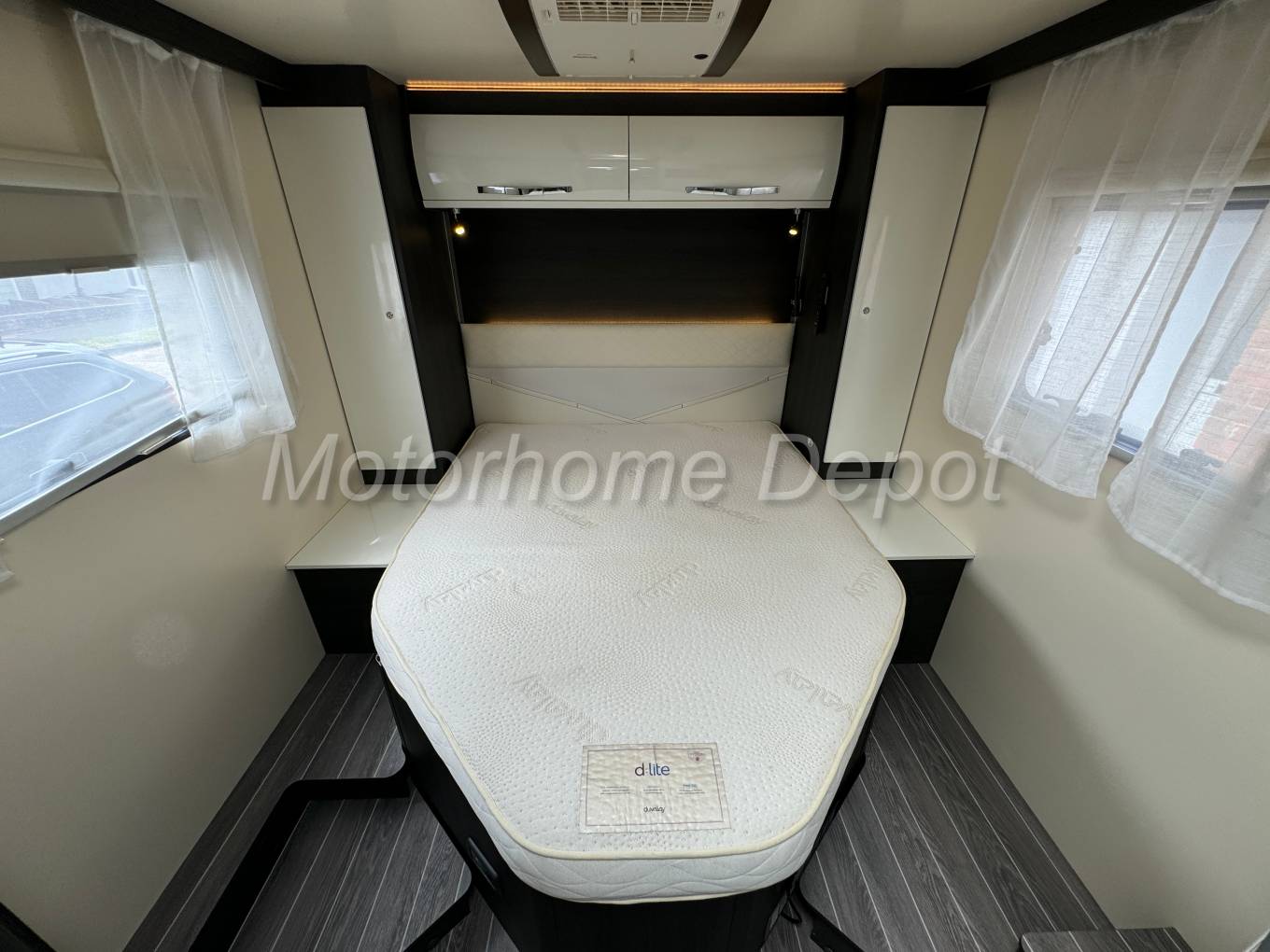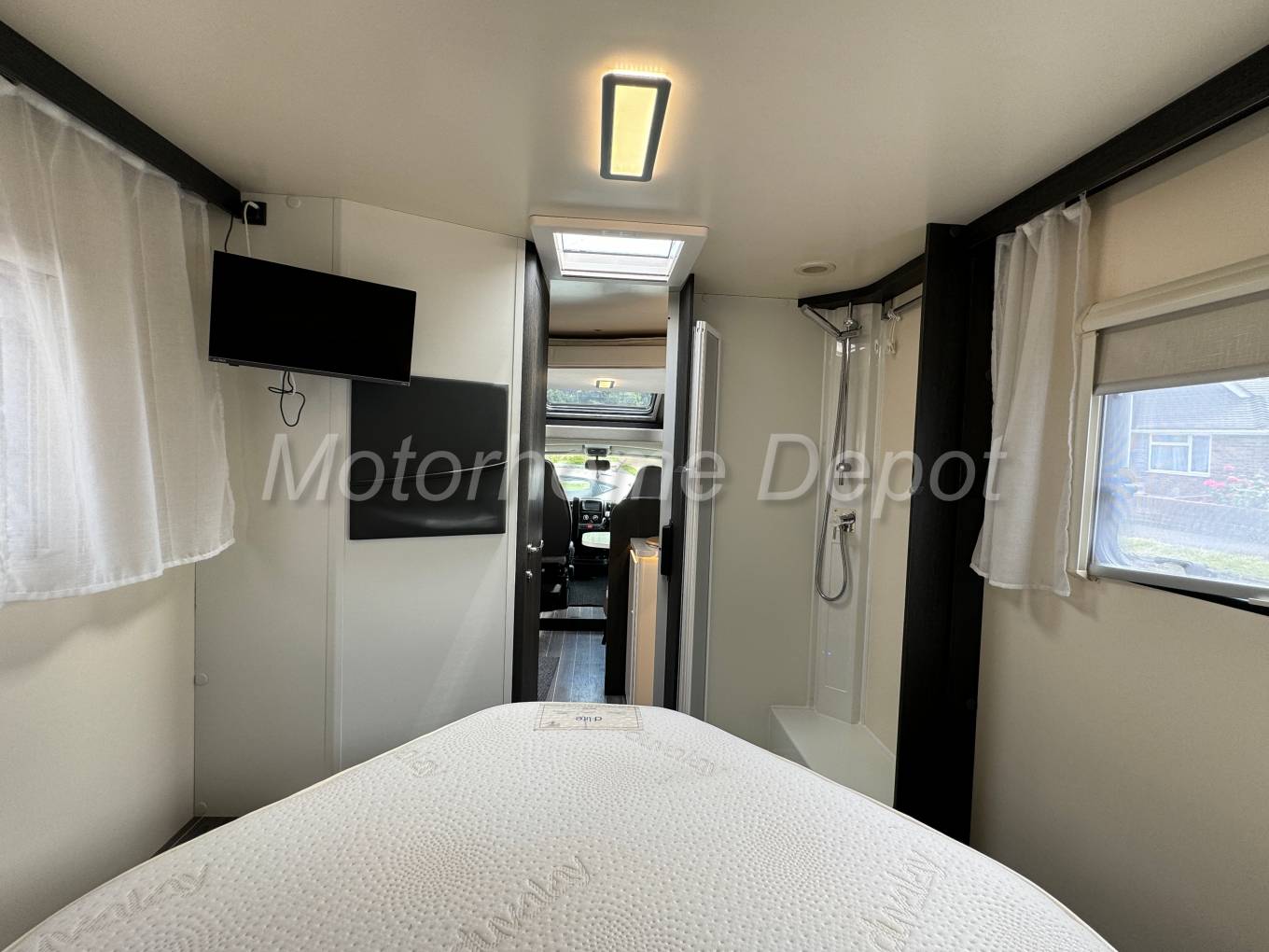 Finally to the rear is the main bedroom with central island bed. There is hanging wardrobe space either side and over head cupboards for your clothes. The foot of the bed lifts to reveal additional storage and access to the Truma boiler. There is a TV point with Avtex Flatscreen TV at the foot of the bed.