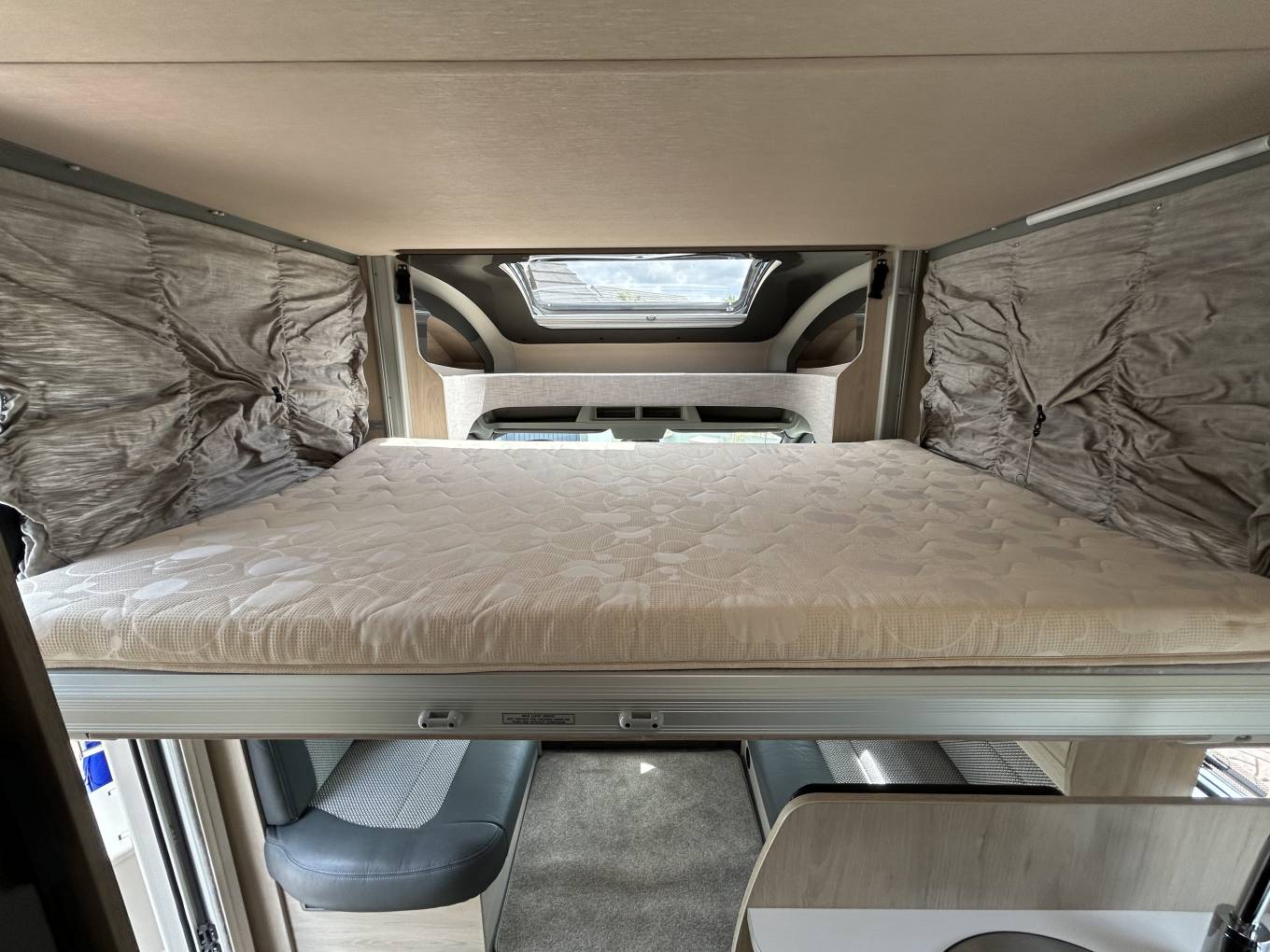 The lounge area behind the cab seats is a lovely feature and you will find the upholstery is in great condition. You have a table that you can use here that stores away nicely when not in use to help relax and enjoy each others company and you could easily sit 4 people around this area when you take advantage of the 2 front swivel seats. The final sleeping area is found in the large electronic drop down bed above the lounge area.