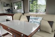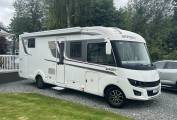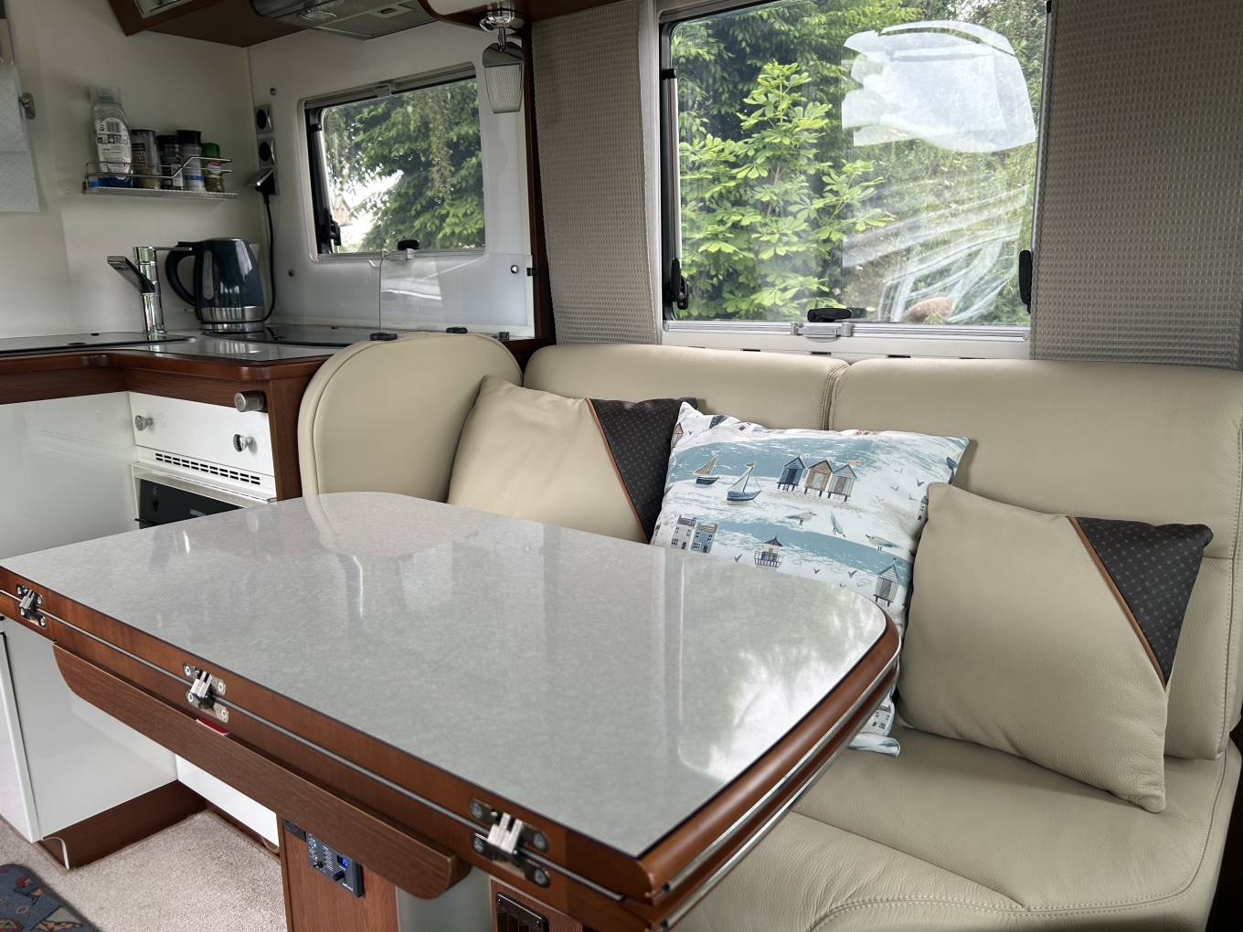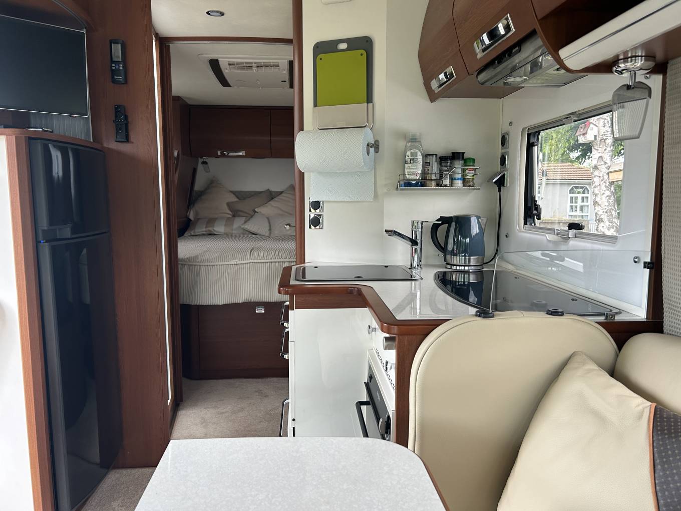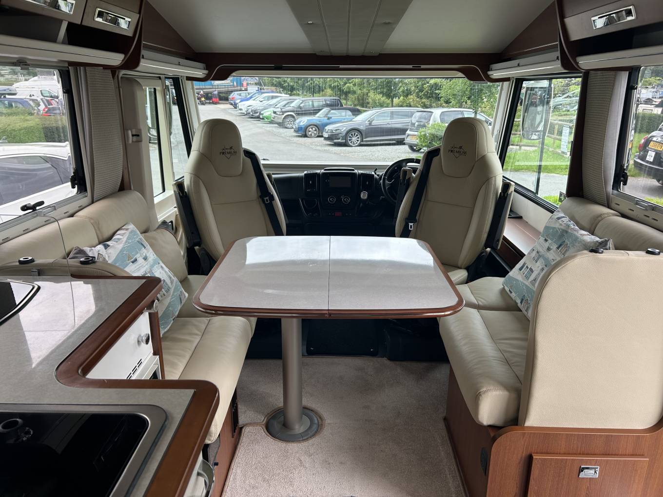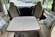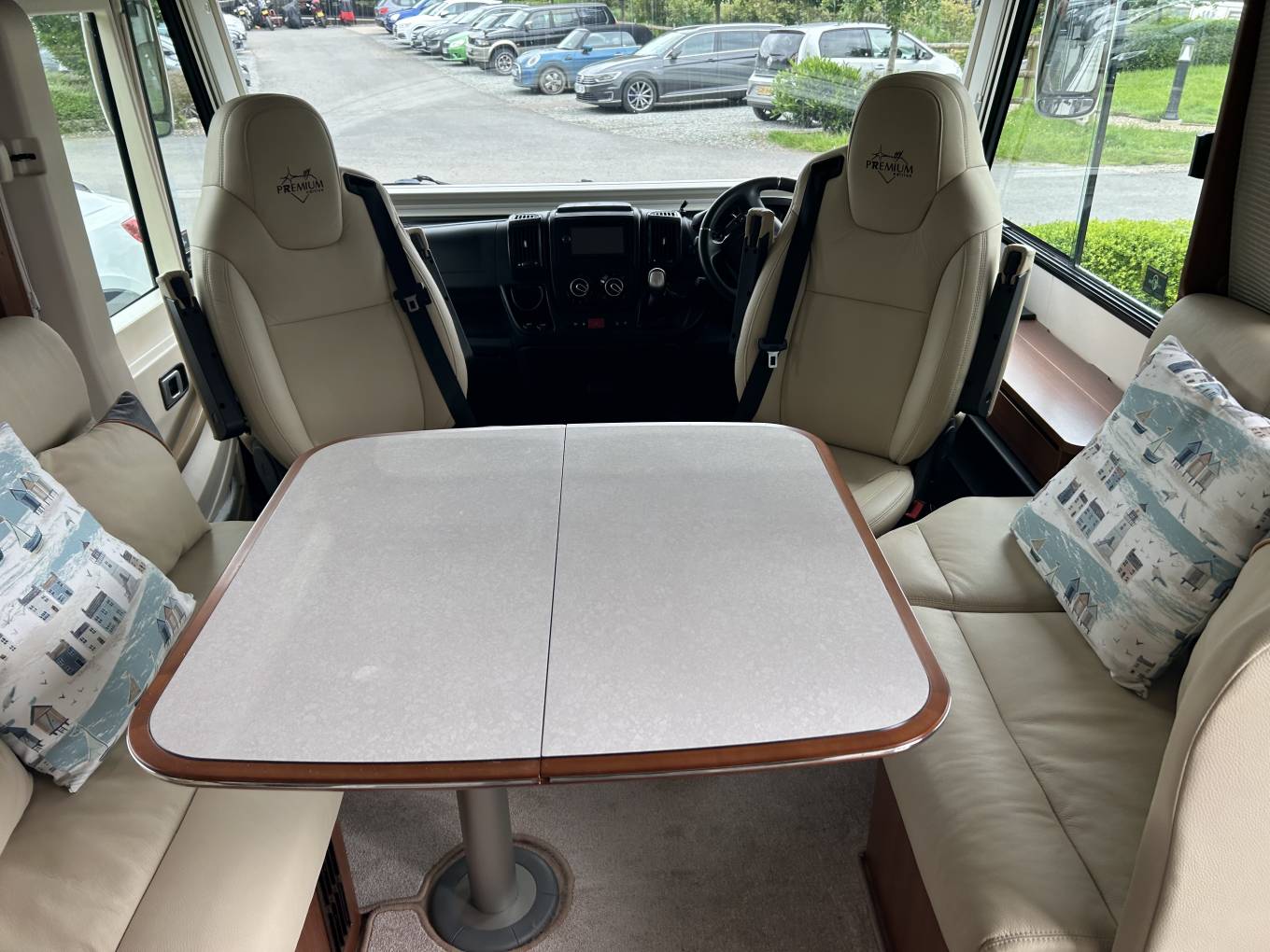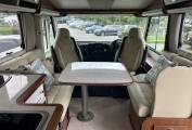This A-Class motorhome is built on the Fiat Ducato chassis and has the 6 speed Comfortmatic gearbox with a 2.3 litre engine and 150 Bhp. The cab comes with air conditioning, cruise control and reversing camera.
