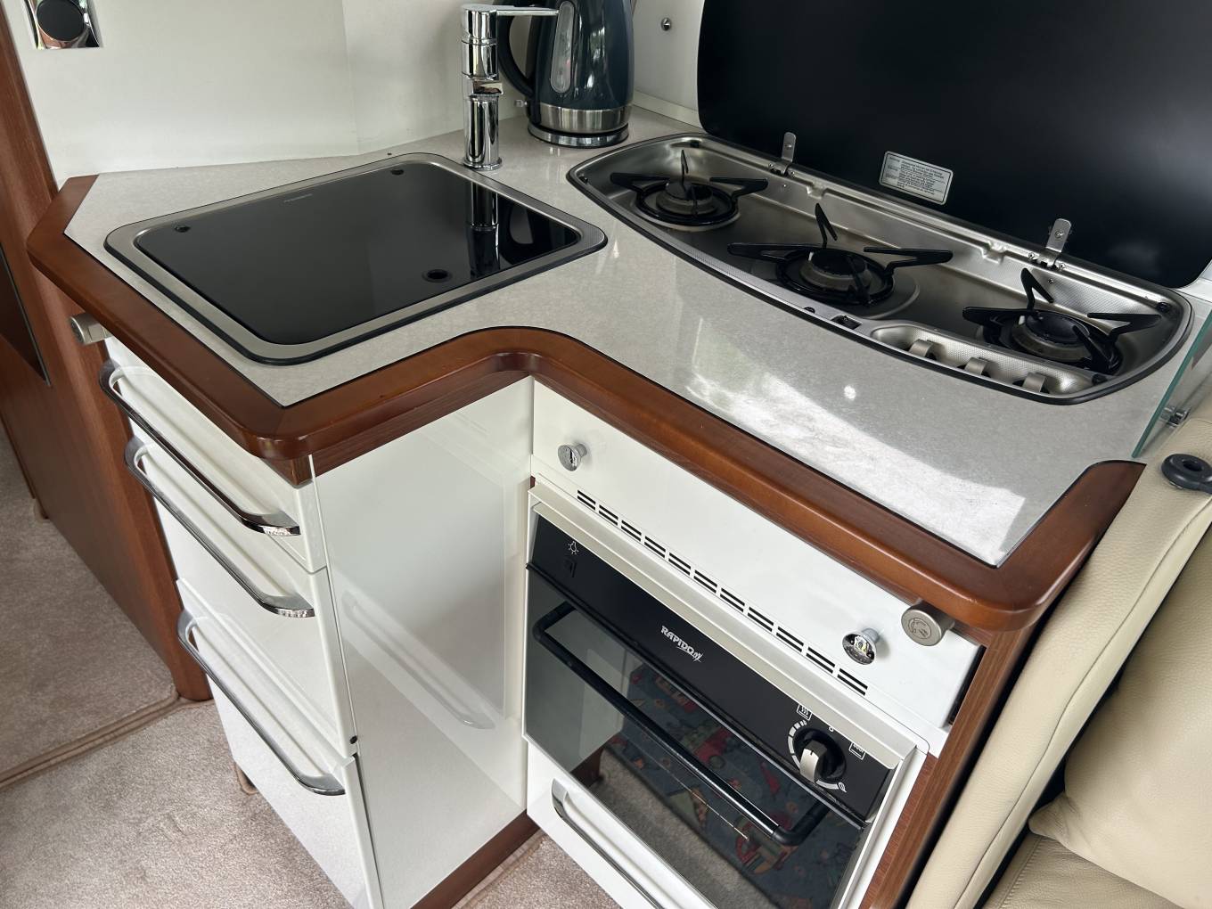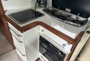 The internal layout of the 8096df is fantastic and ideal for a couple looking to spend long periods away, travelling the UK or Europe. At the front of the motorhome you have a spacious and comfortable lounge area that makes use of the two captains chairs and two side facing sofas. As mentioned these have been recovered so are in amazing condition. In the centre there is a multi-directional table, ideal for meals or even reading the paper or browsing a tablet. The motorhome comes with two Avtexs TVs so an ideal space to relax. Moving back you have a well equipped kitchen that features an oven, grill and gas hob with 3 burners, a 3-way fridge with separate freezer and sink with mixer tap.