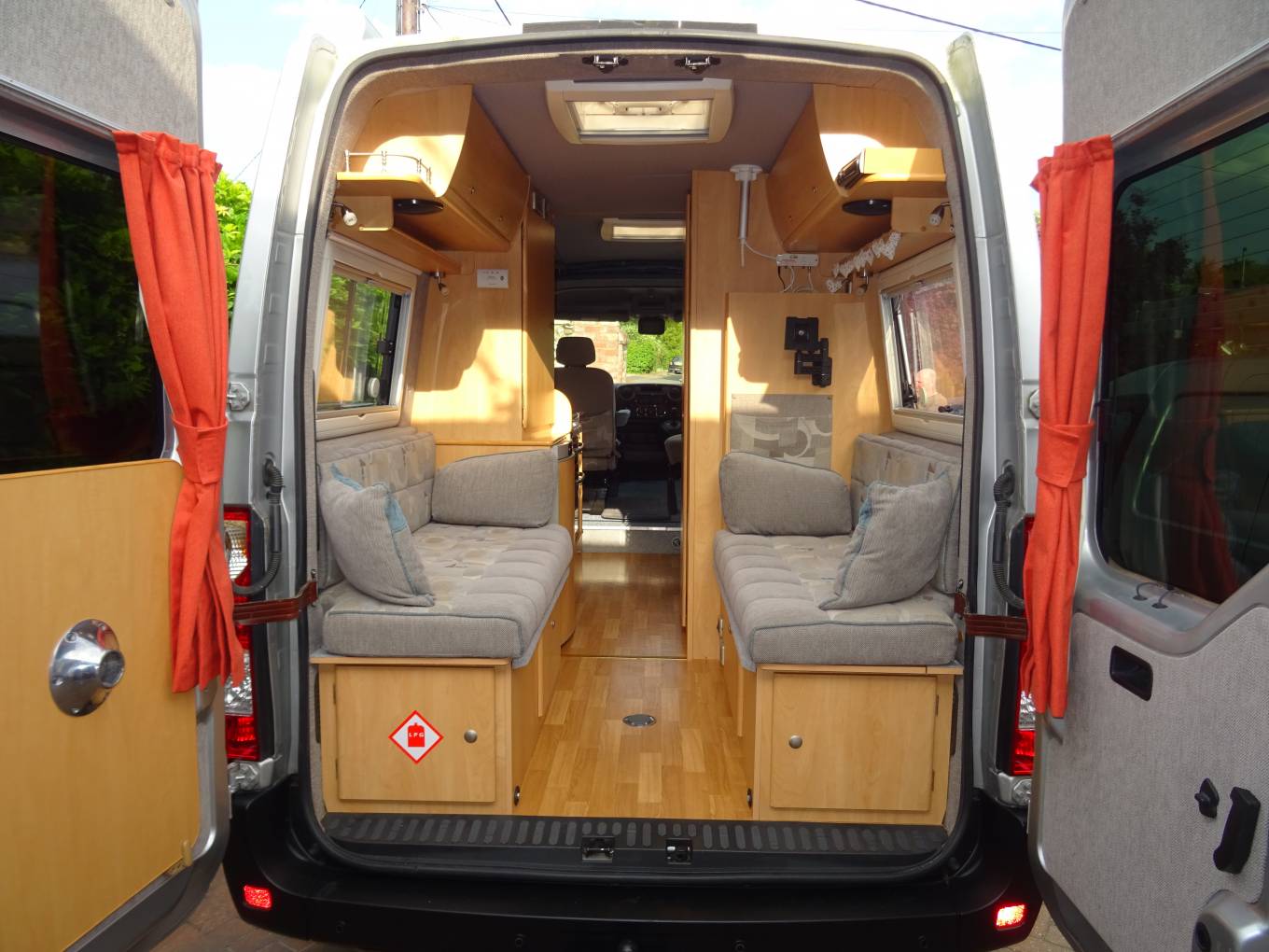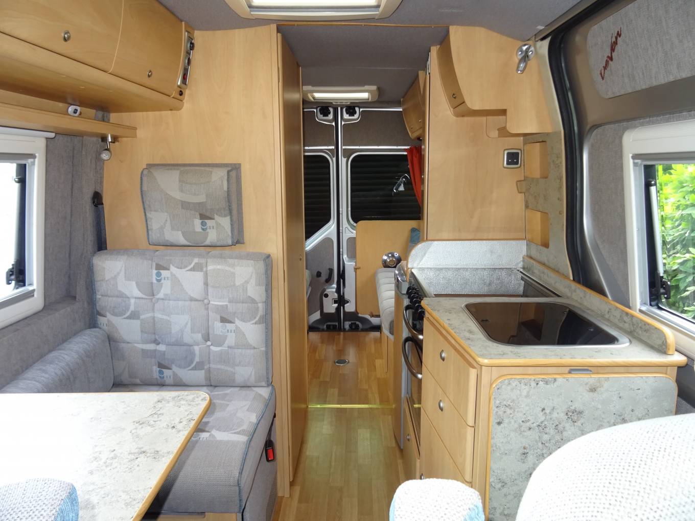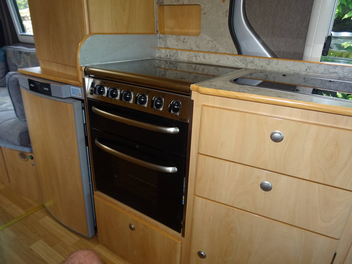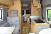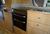As you enter the side door in front of you is a single seat with folding table. Moving to the front both driver and passenger seats swivel round. The single seat will also fold down to create a single berth. The well equipped kitchen area is immediately to the right of the side door and has oven, grill and gas hob with 4 burners, oven and grill, fridge with freezer compartment.
