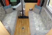 To the rear of the camper there is a nice size lounge area to relax in with two side facing bench sofas with removable table. This area also makes into a double bed. The Washroom is a compact wet room style with electric flush, cassette toilet, fold away sink and shower.