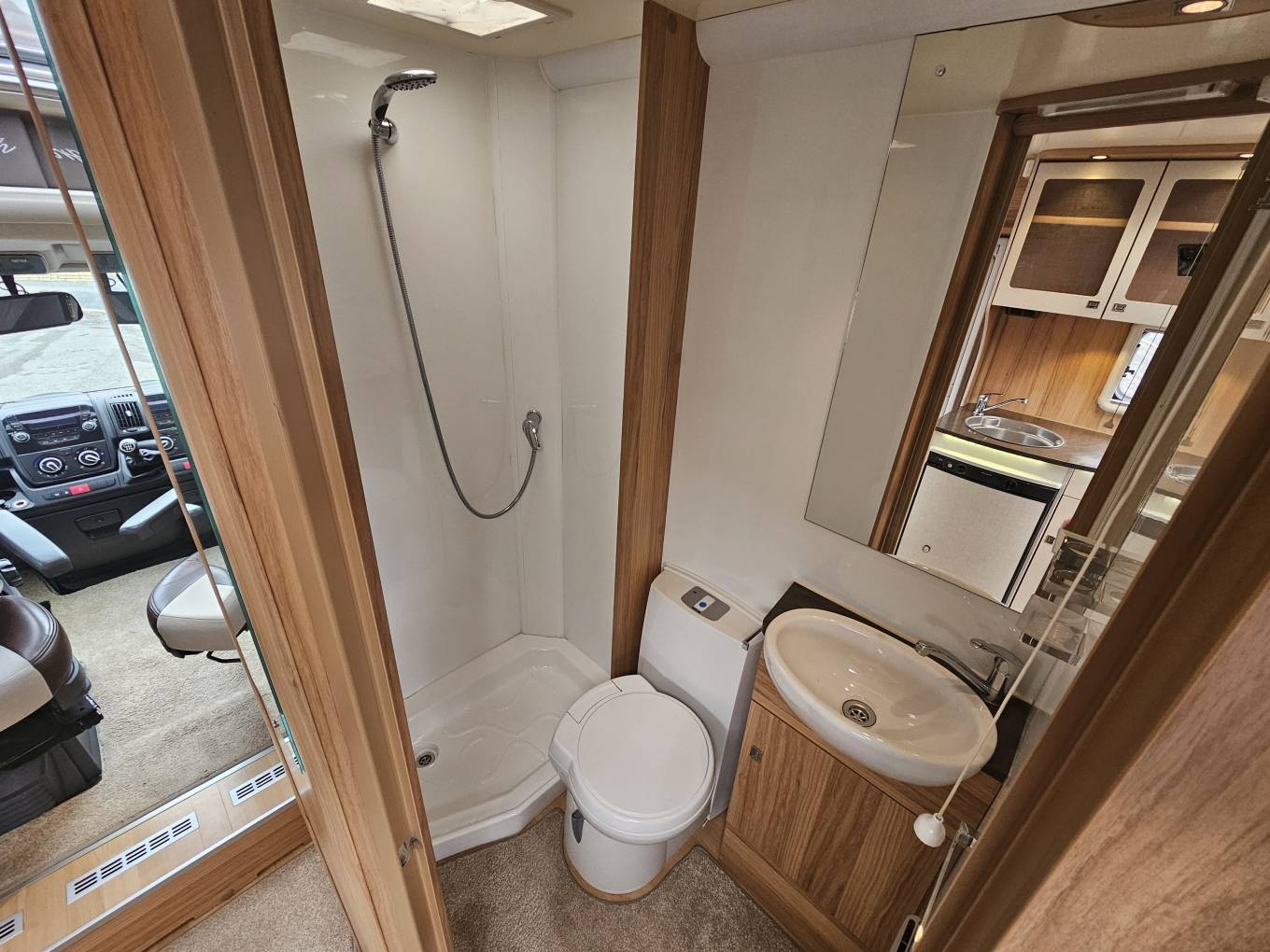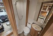 The washroom, conveniently located opposite the kitchen, includes a separate shower, cassette toilet, wash basin with mixer tap, and a large mirror, offering all the comforts of home.