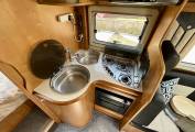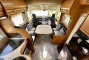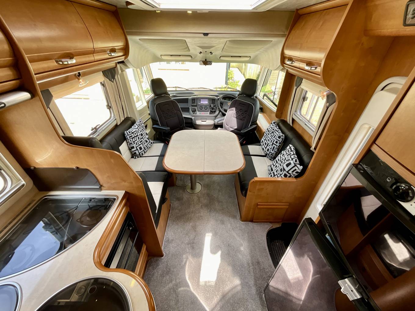 A well equipped kitchen sits in the middle of the motorhome, completed with Dometic fridge with freezer, three gas hobs, oven/grill, three gas hobs, Baraldi extractor and sink with two basins. Storage is prevalent throughout for all crockery, condiments and cutlery.