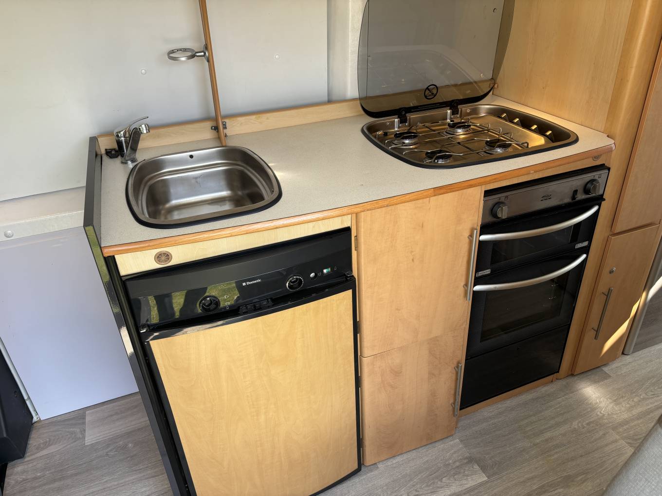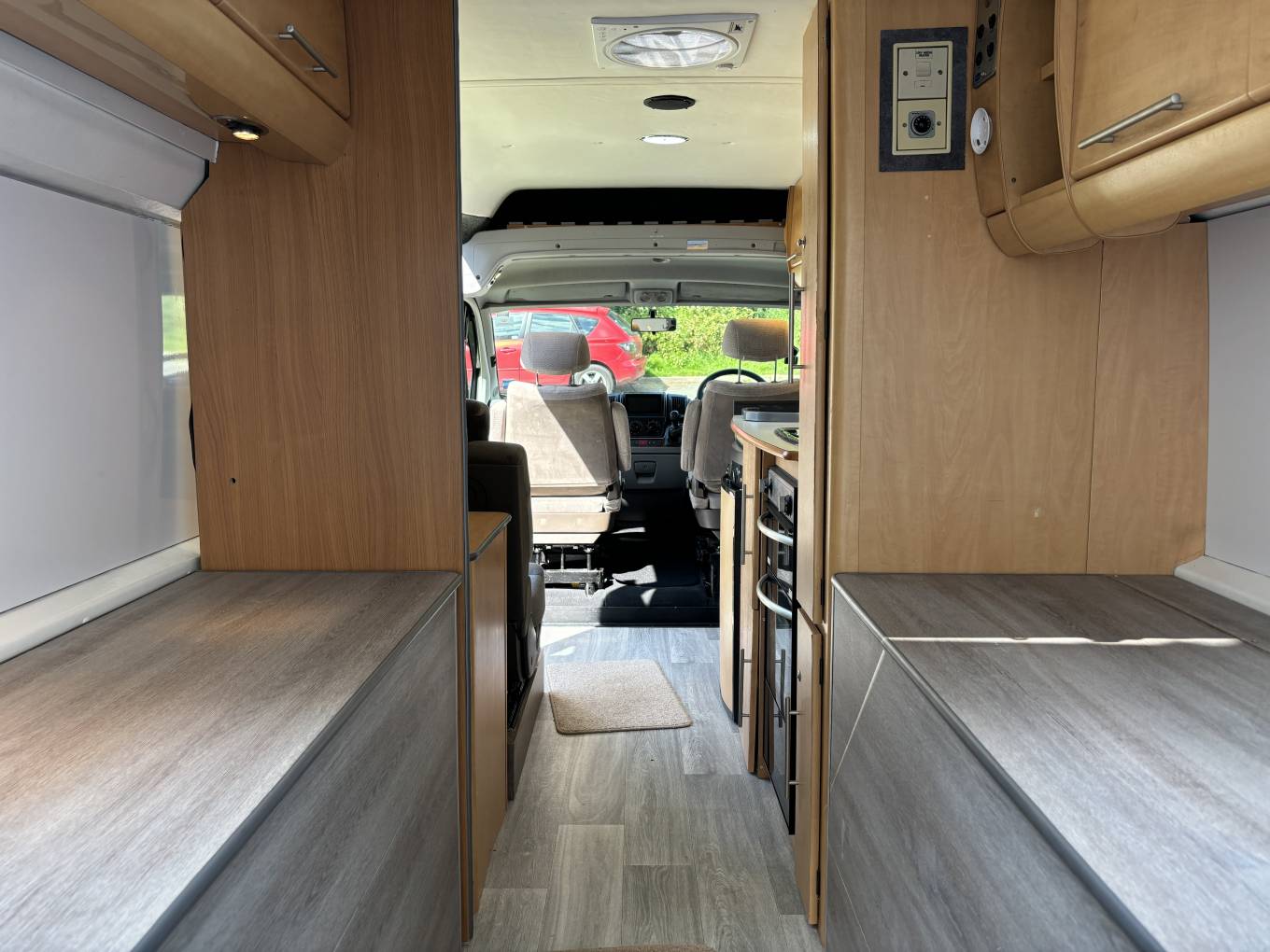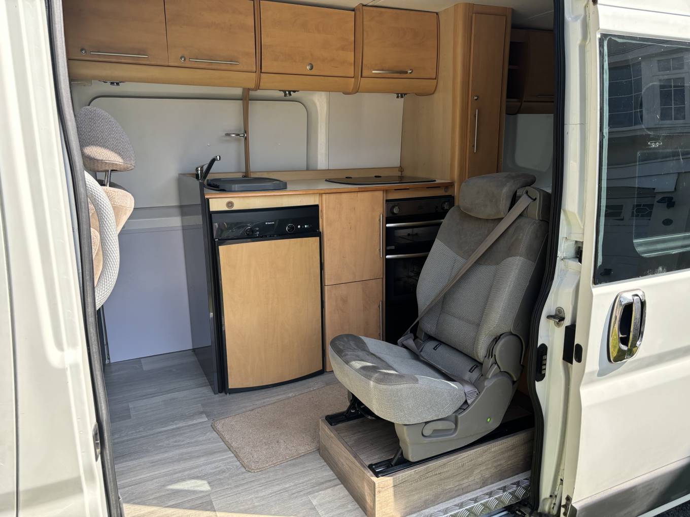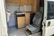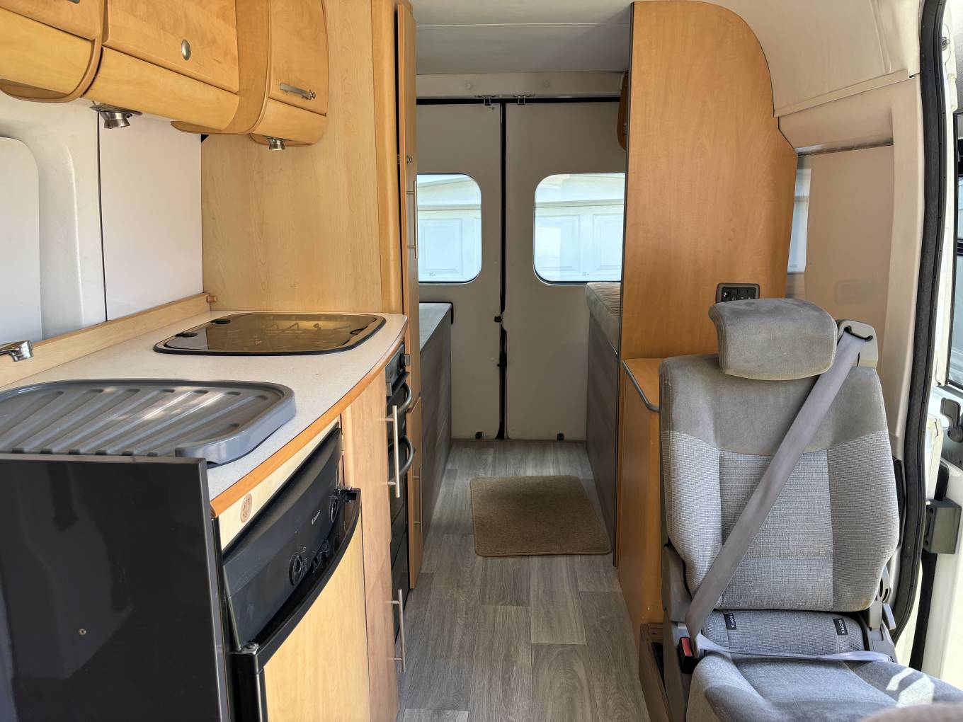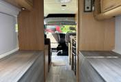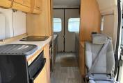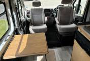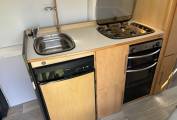 At the rear there are 2 storage areas on either side which can be used as seating or connected to convert into a double bed. Further forward there is a kitchen fully fitted with sink, 4 gas hobs, 3 way fridge, oven and grill. The living area is spacious for a van of this kind and it is high enough to stand up in so it is practical.