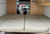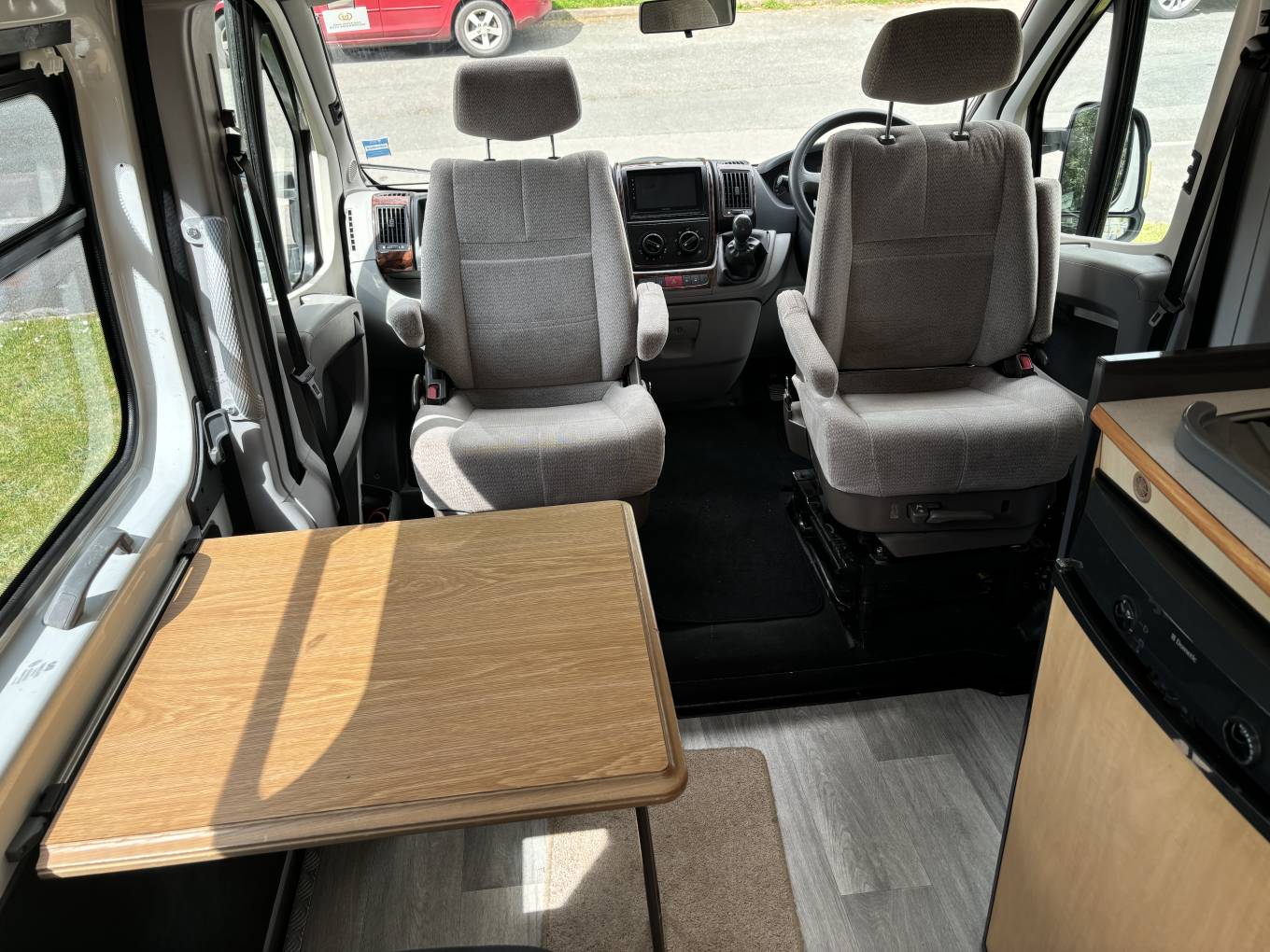 Towards the front there is a belted back seat which forms a dinette area with the 2 front swivel seats and a fold away table. There is also a free standing Thetford toilet with a cassette which can be covered when not in use.