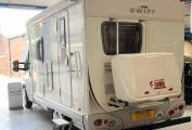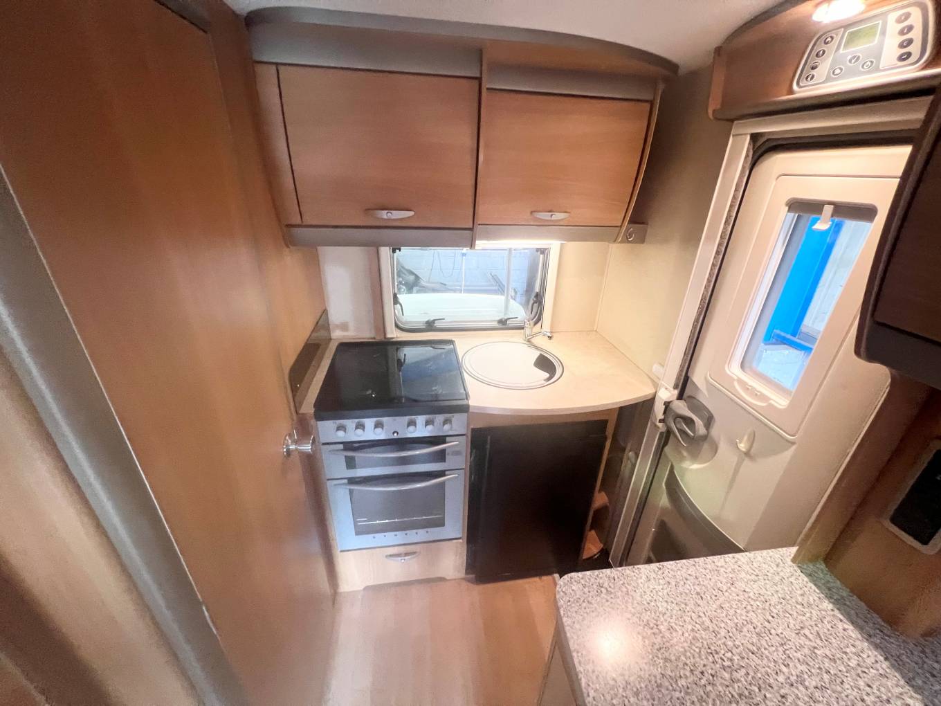 The washroom has a shower head built into the tap and there is also a screen that pulls across the rest of the washroom so you don't have to wipe everything down after use. There is a wash basin with a mixer tap, a large mirror, a bathroom cupboard for your toiletries and a cassette toilet. Then at the rear you find the kitchen which has a hob with an electric hotplate and 3 gas burners, an oven and grill, a 3 way fridge freezer and sink with drainer.