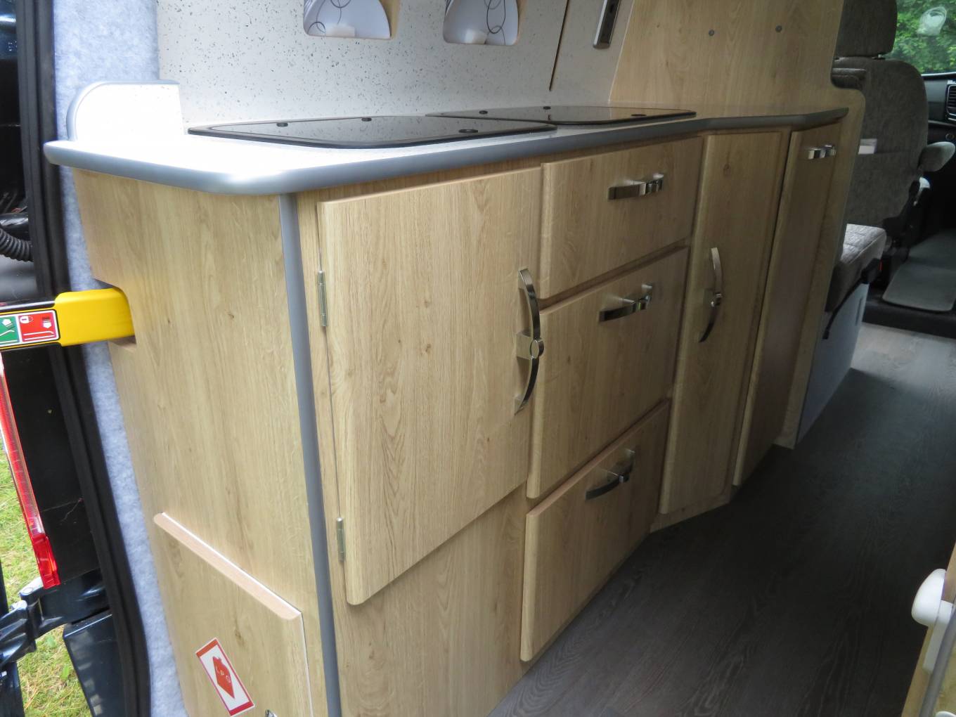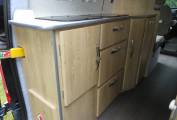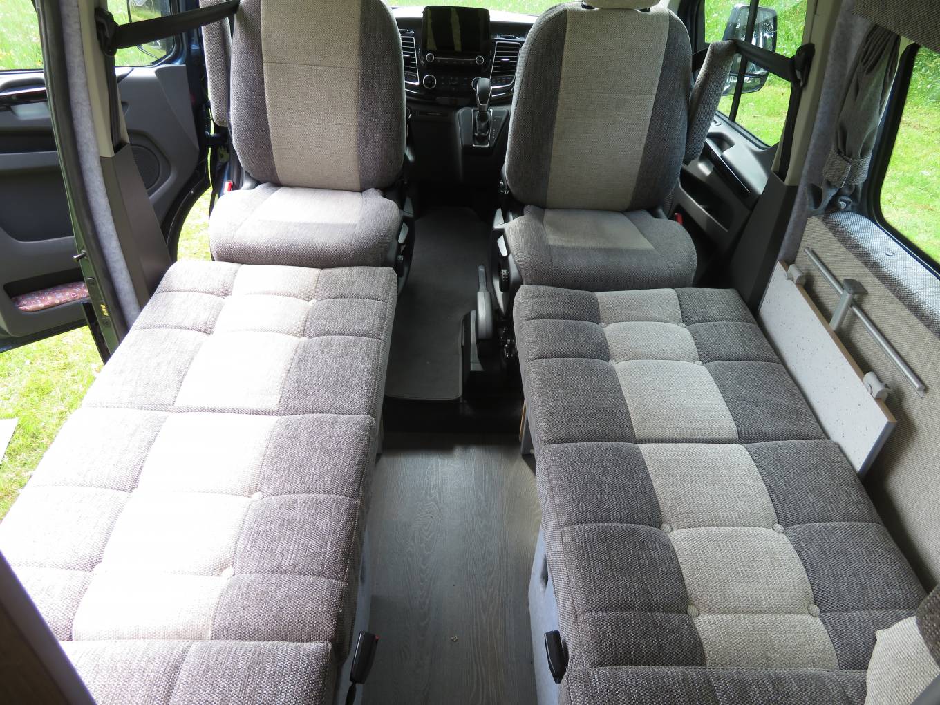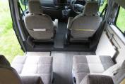 As you enter the camper from the side sliding door there is a comfortable lounge area which consists of swivel front captain’s chairs and 2 rear forward facing belted seats along with tables which are stored away whilst traveling, one of which has a tripod stand so can be used to picnic outside if desired. This area quickly converts into 2 single beds during the evening.