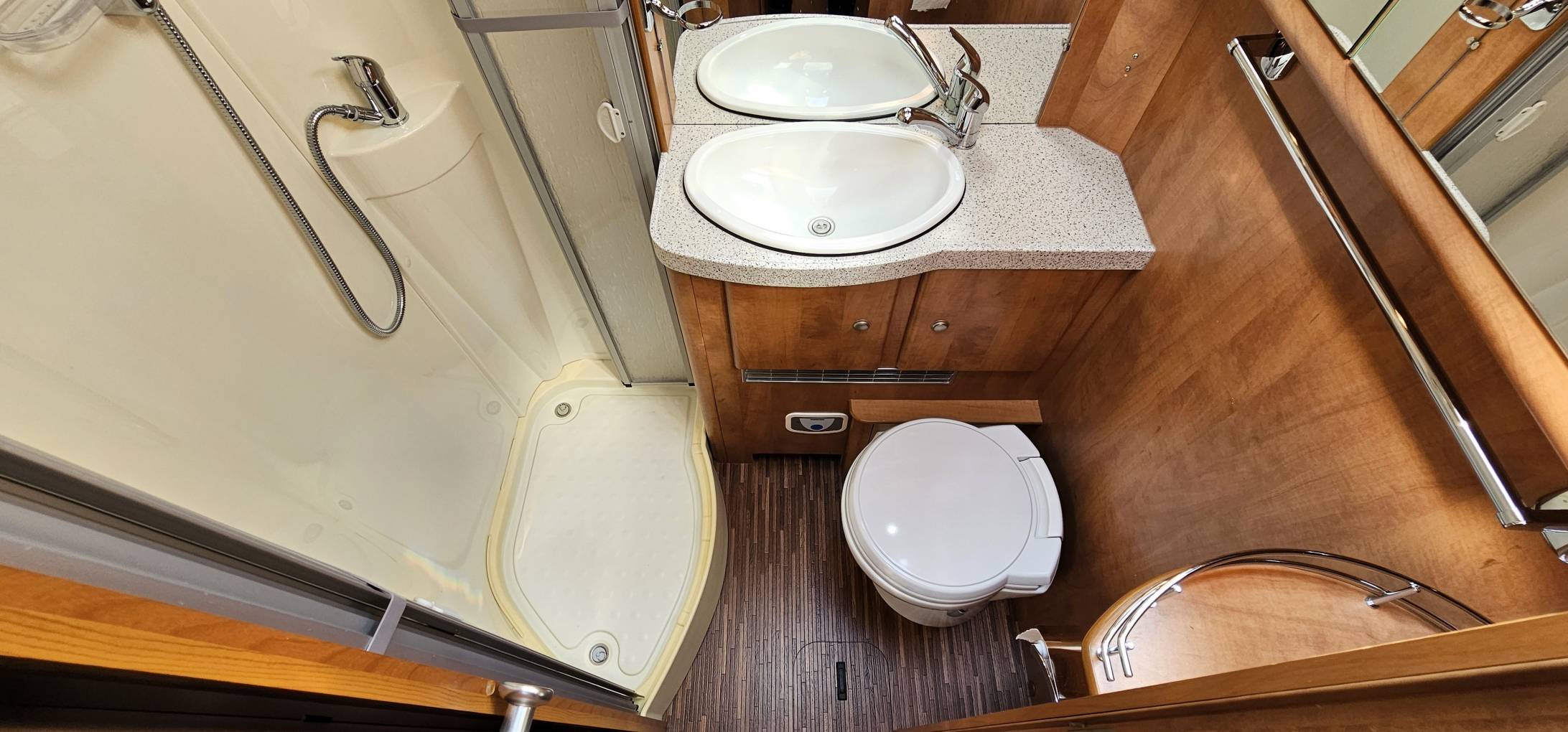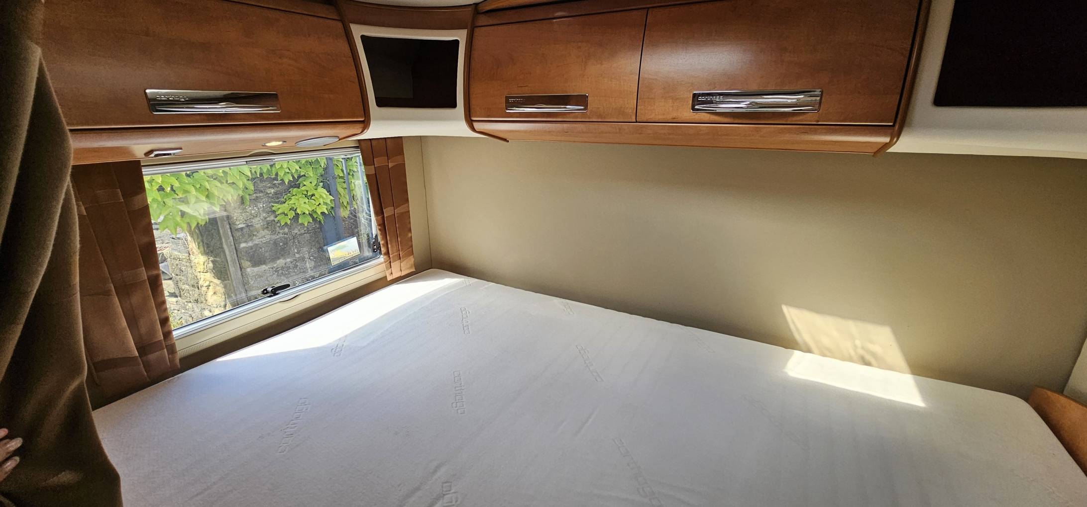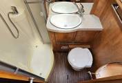 Moving rear again is the large all in one bathroom with separate shower cubicle that can be closed off with Perspex doors. The toilet is a cassette style Thetford fresh water flush with swivel head. There is a white sink above with chrome mixer tap. Plenty of cupboard space for all your grooming accessories.