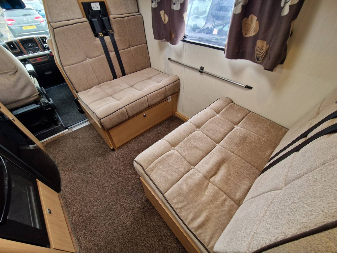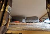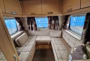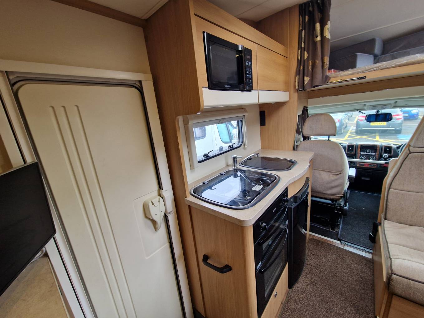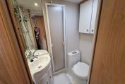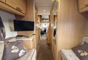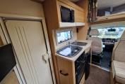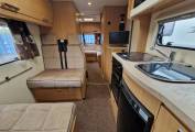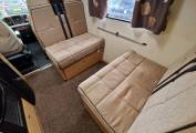 Up front is the well specified kitchen with 3 gas burner hob with oven and separate grill below. To the side is a sink with mixer tap and under counter three way fridge with freezer box. A microwave oven is located above with locker storage and drawers for all your bits and pieces. To the side is a seperate 4 seater dining space with a further 4 seatbelts and this converts easily to a good sized double bed if required. Another TV is conveniently placed for watching in this area.A further very large fixed overhead cab bed completes the 6 berths and has its own ladder for access.