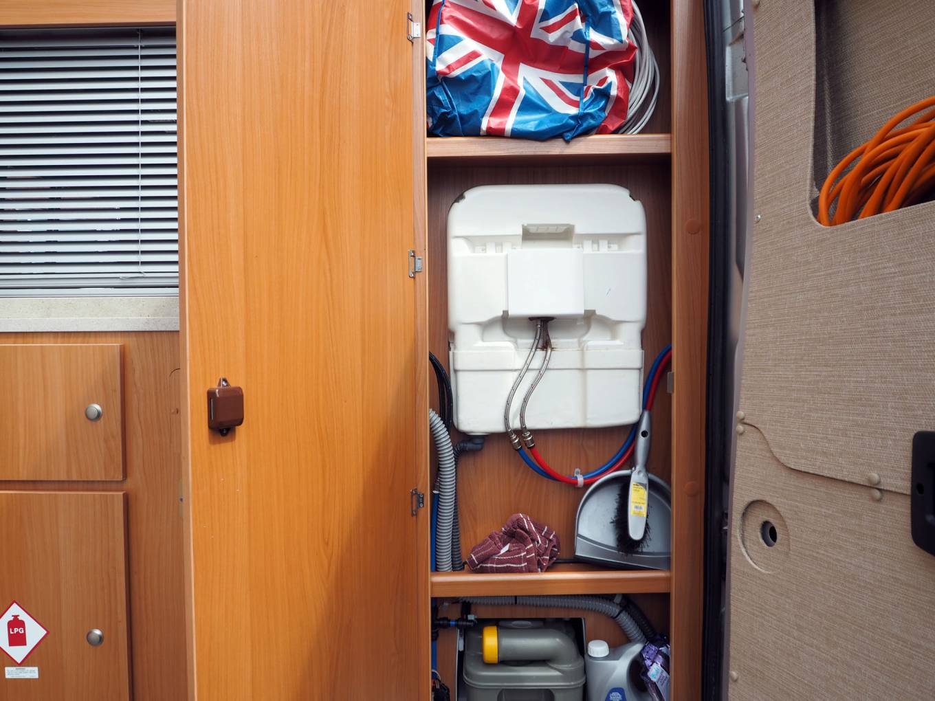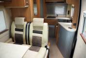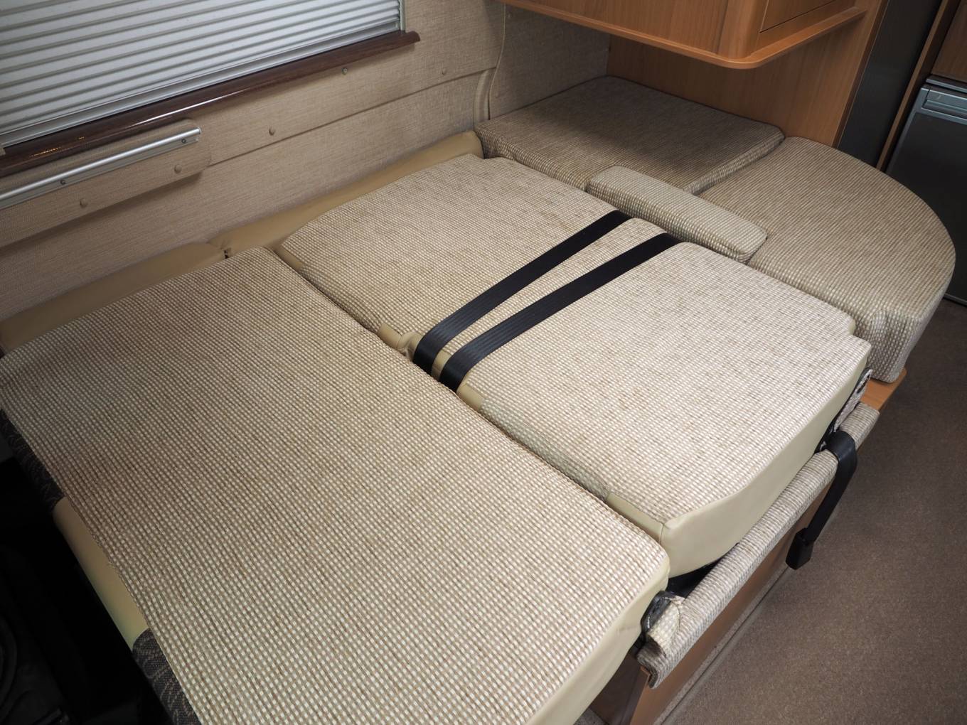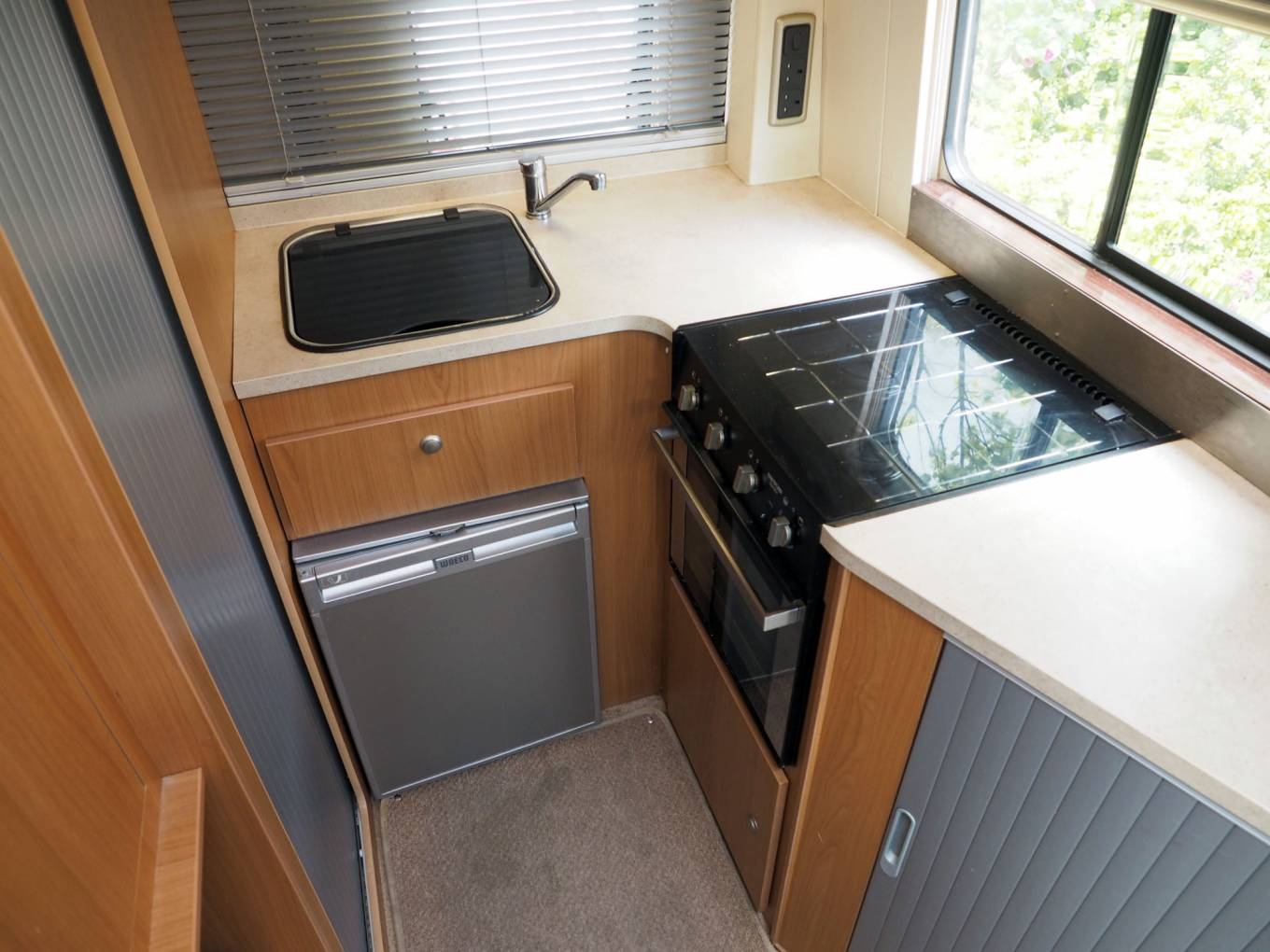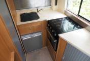 The dinette is light and airy, with Heki rooflight above, a good range of storage including an underfloor compartment, plus a slide out TV station. The kitchen features gas hob oven and grill, fridge, sink and plenty of worksurface area, power sockets and storage, while the adjacent wasrhoom offers a tip up vanity sink, toilet and shower. Opening the rear doors gives access to the gas compartment, toilet cassette and additional storage for fluids etc.