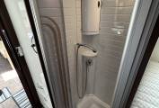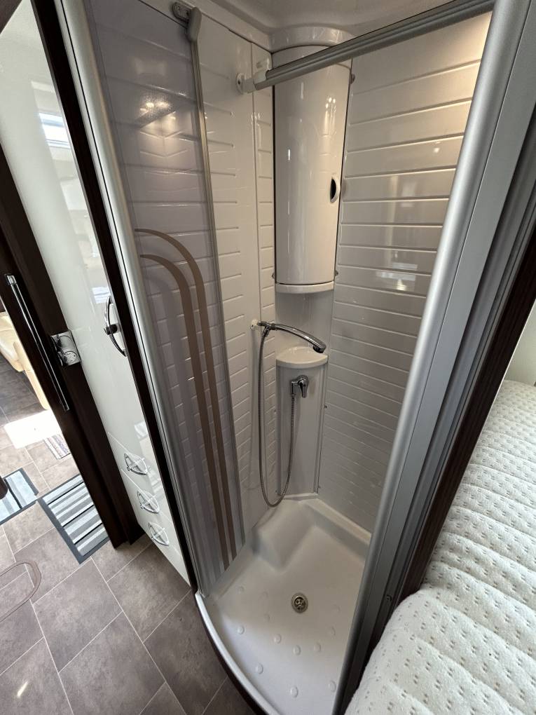 The gorgeous bathroom features a large separate shower on one side of the motorhome and on the other side is a Thetford cassette toilet, a wash basin with a mixer tap, a large mirror and a stylish bathroom cupboard for toiletries.