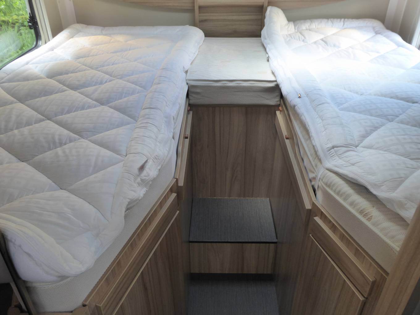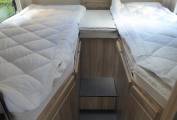 2 single fixed beds, which then make into large double, with storage above and below including hanging wardrobe