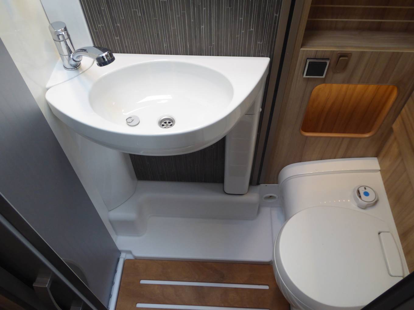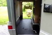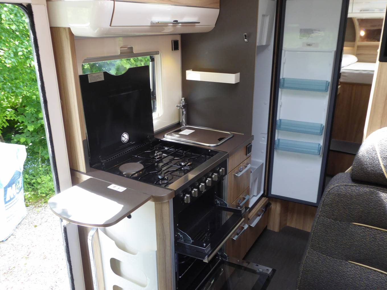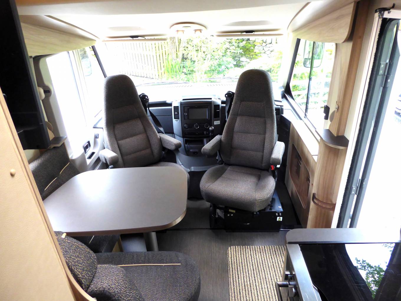 Within the front lounge, with the “special edition” upholstery is an L shape sofa, with 2 seatbelts. When combined with the 2 captains seats this area can easily seat 4-5 people
