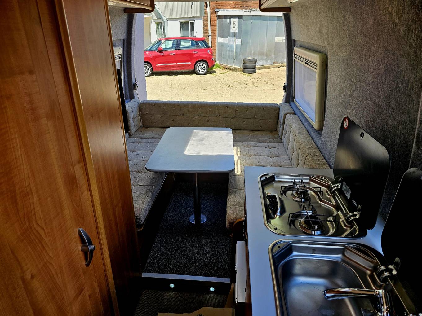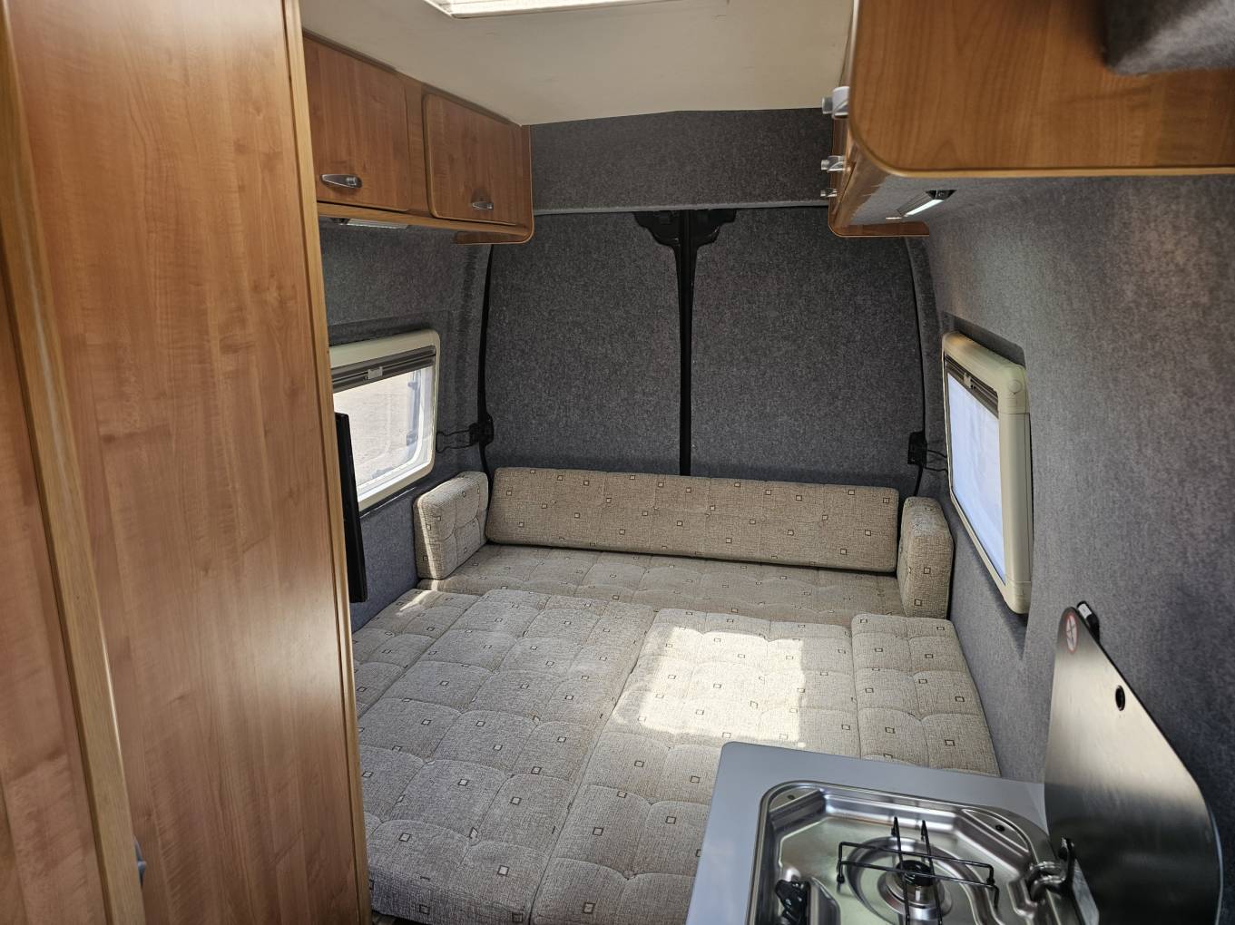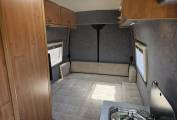 The end lounge provides a spacious dining and relaxing area with a wall mounted TV. At nighttime this quickly transforms into a good sized double bed. There is also under bed storage.