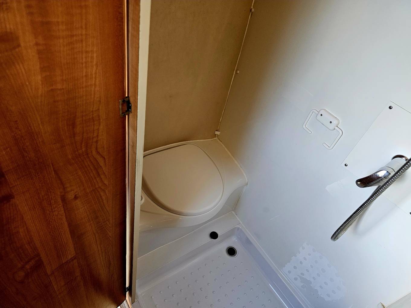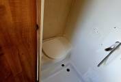 The bathroom is equipped with a shower, toilet and drop down sink.