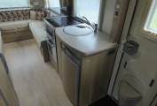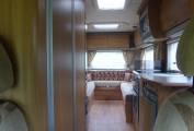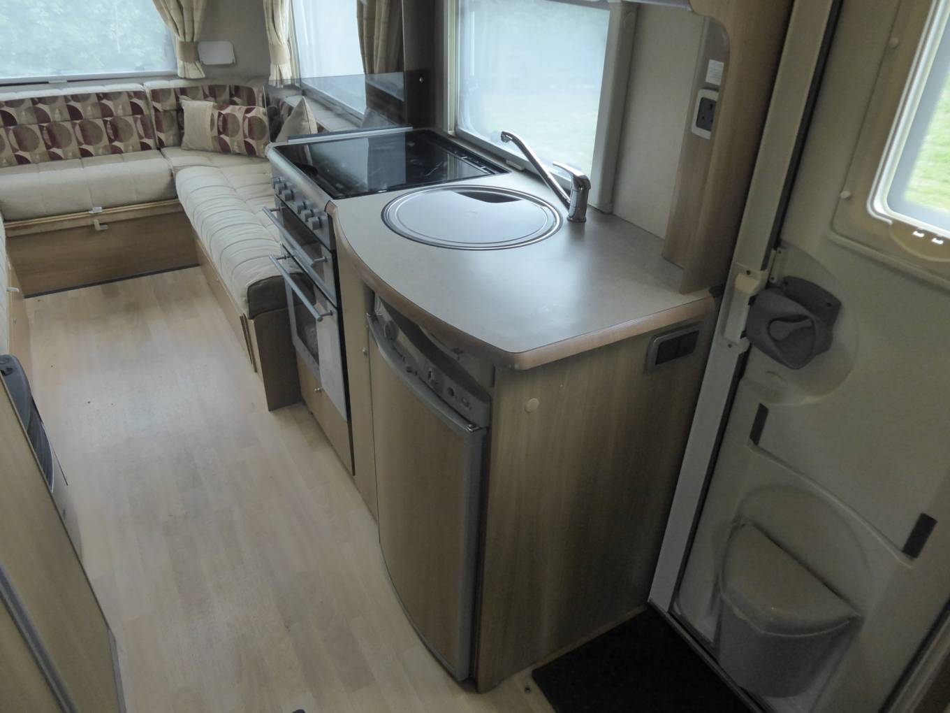 Beyond the nearside habitation door there is a central kitchen with a hob with 3 gas burners and an electric plate, an oven, a grill, a fridge with a freezer box, and a sink.