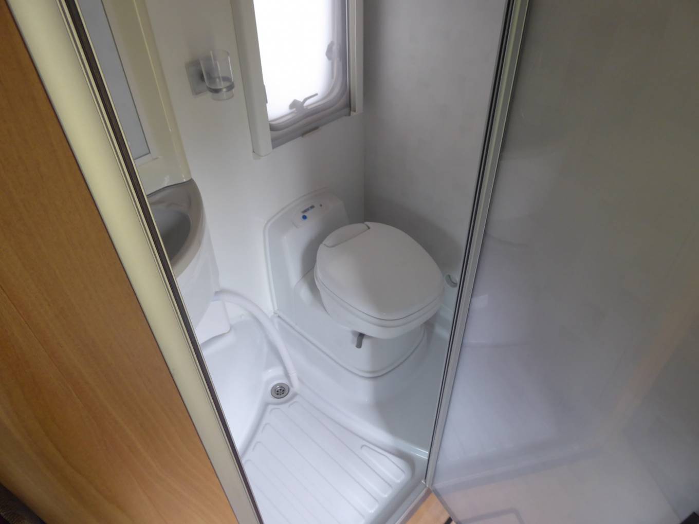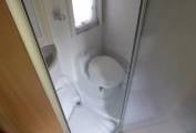 Opposite the kitchen, is the bathroom with a folding shower cubicle, a toilet, and a hand basin.