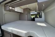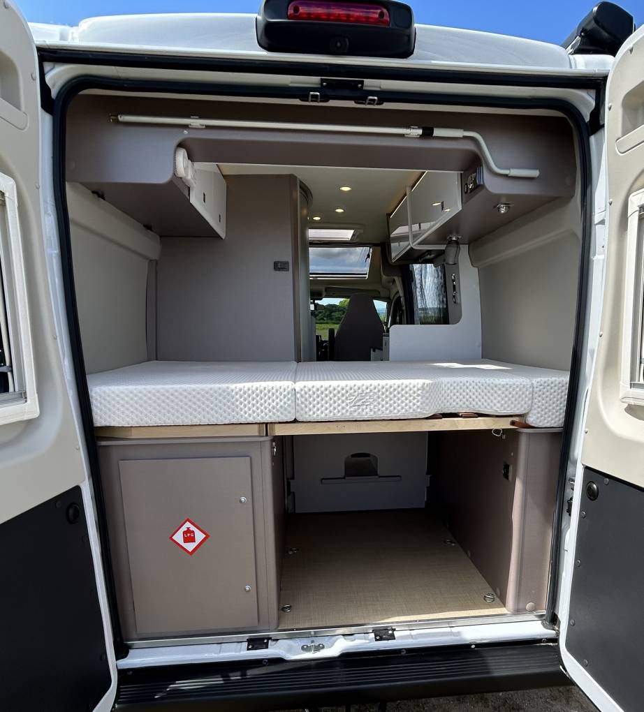 This camper has a fixed transverse double bed across the rear