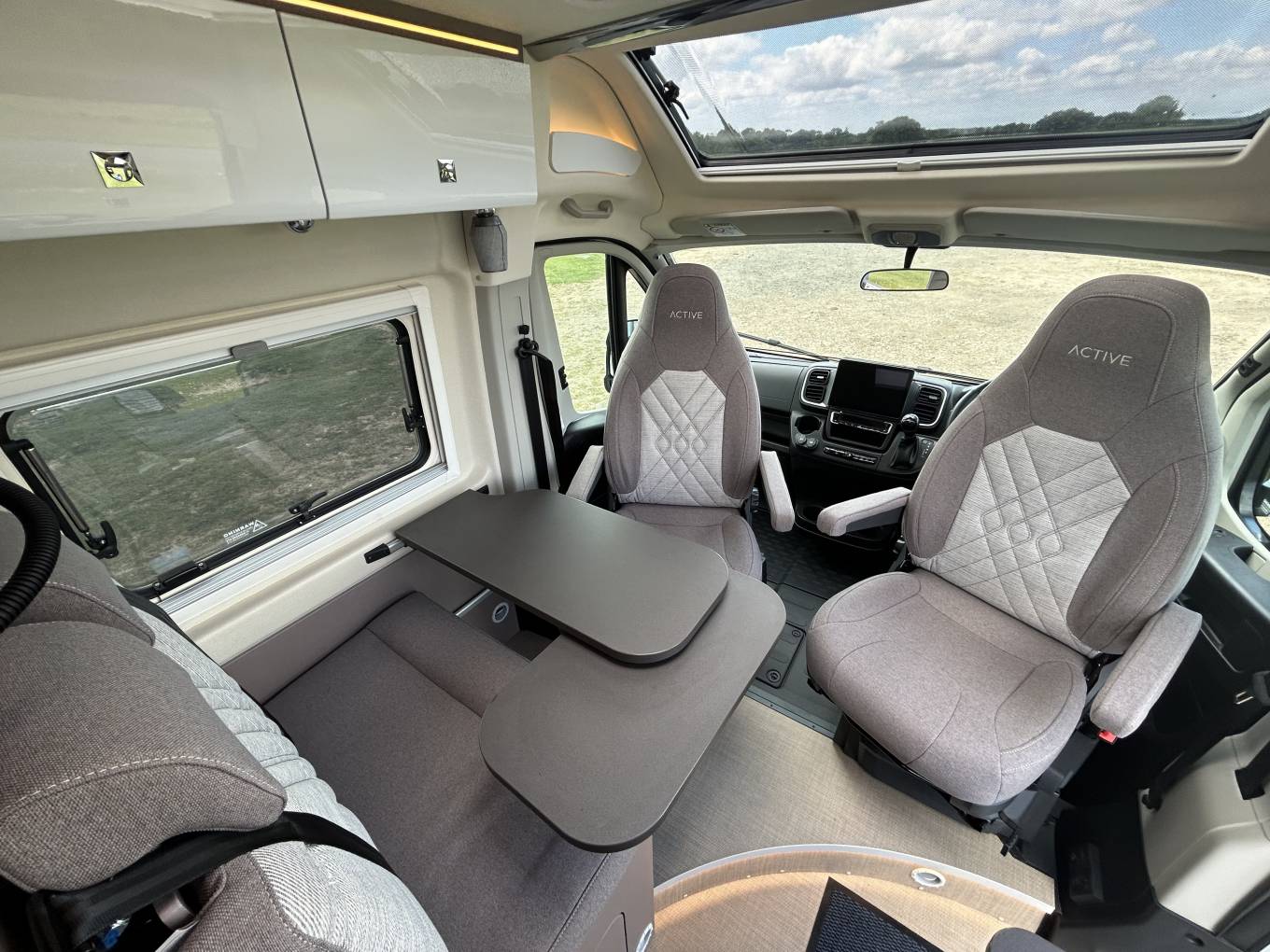 skylight and a large panoramic window. The cab area is sleek and smart and with