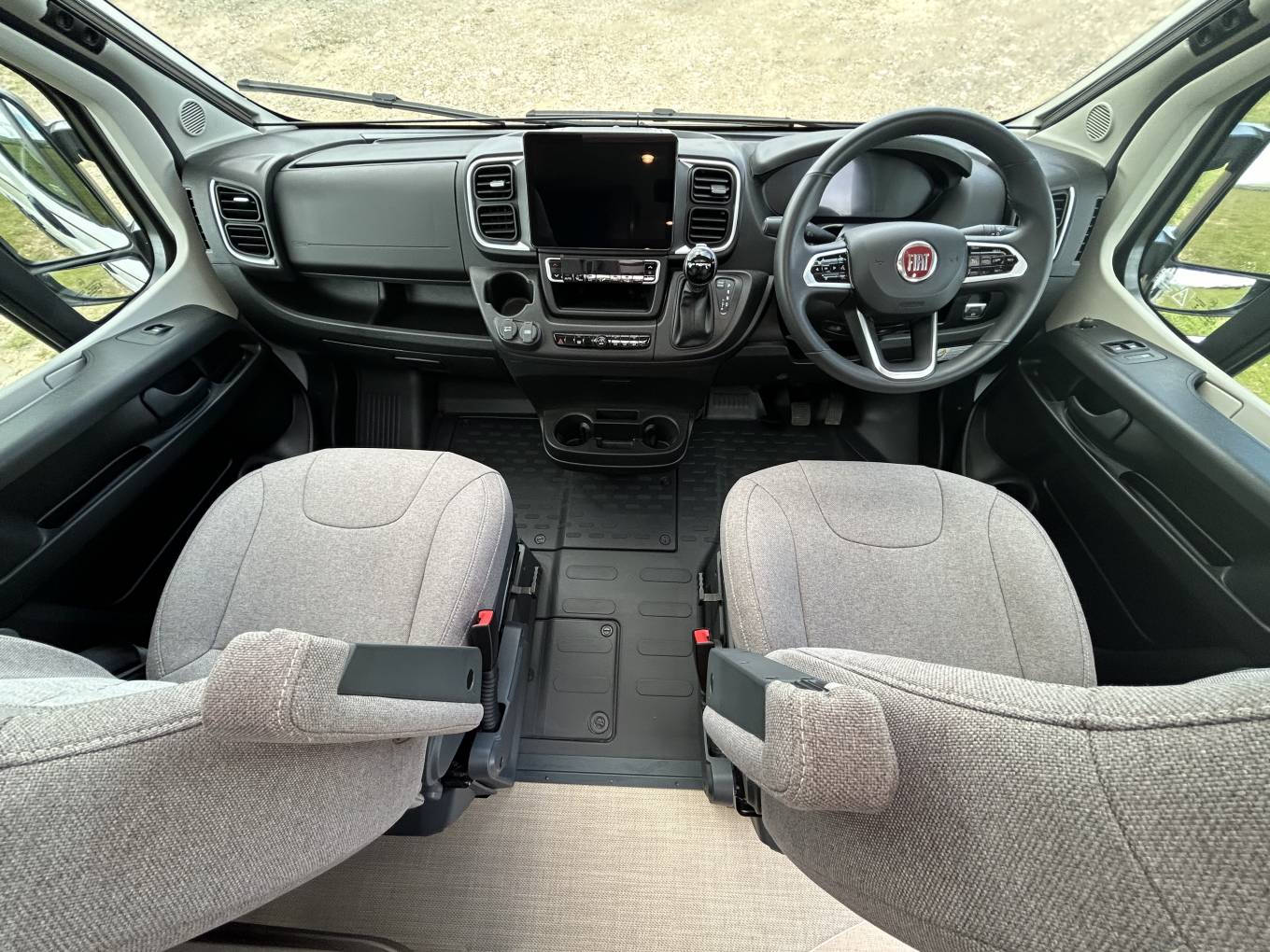 front seats both swivel around into the lounge area. There is a side window, a