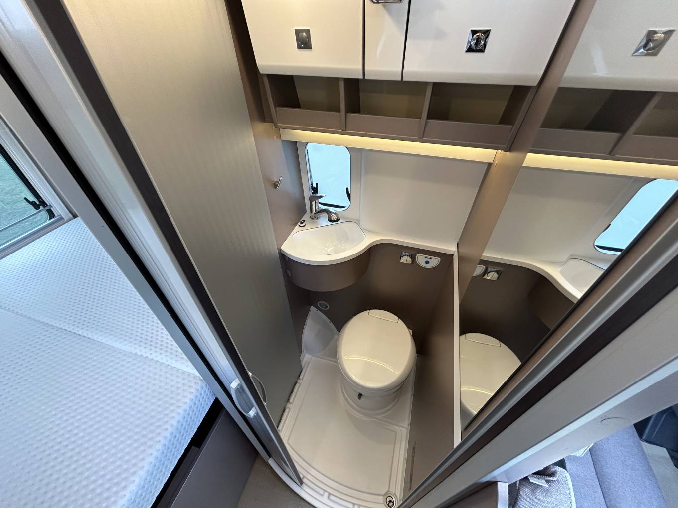 There is ample storage in overhead lockers, a pull-out cupboard and three
