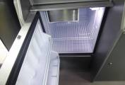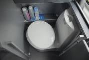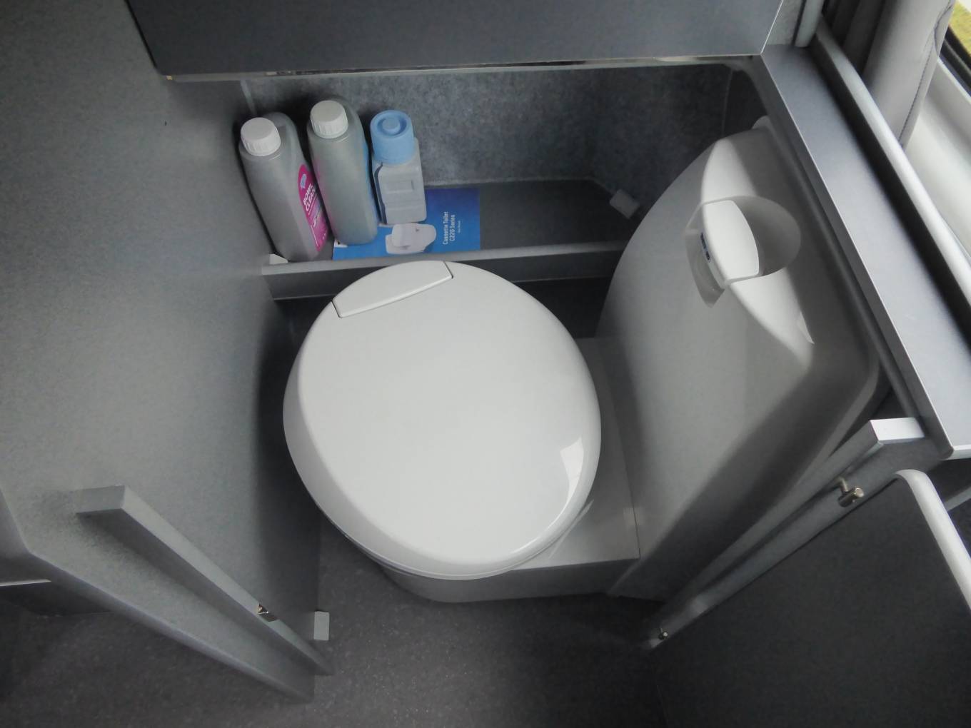 The offside rear has a fridge/freezer followed by a cassette toilet concealed behind a door and work surface.
