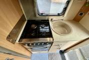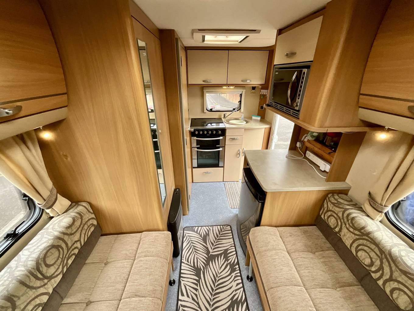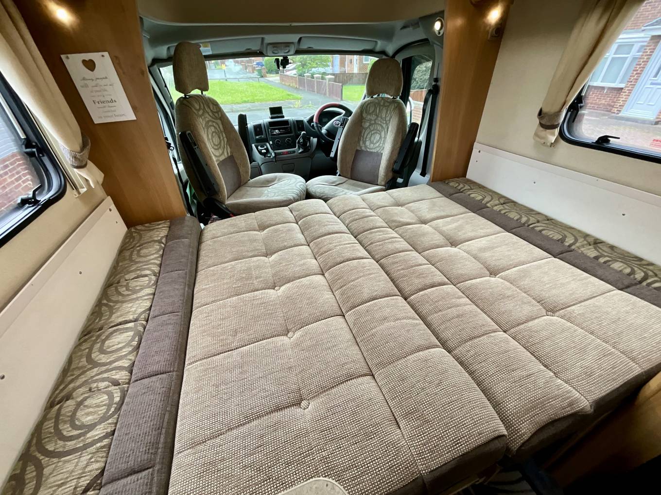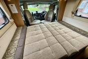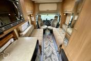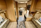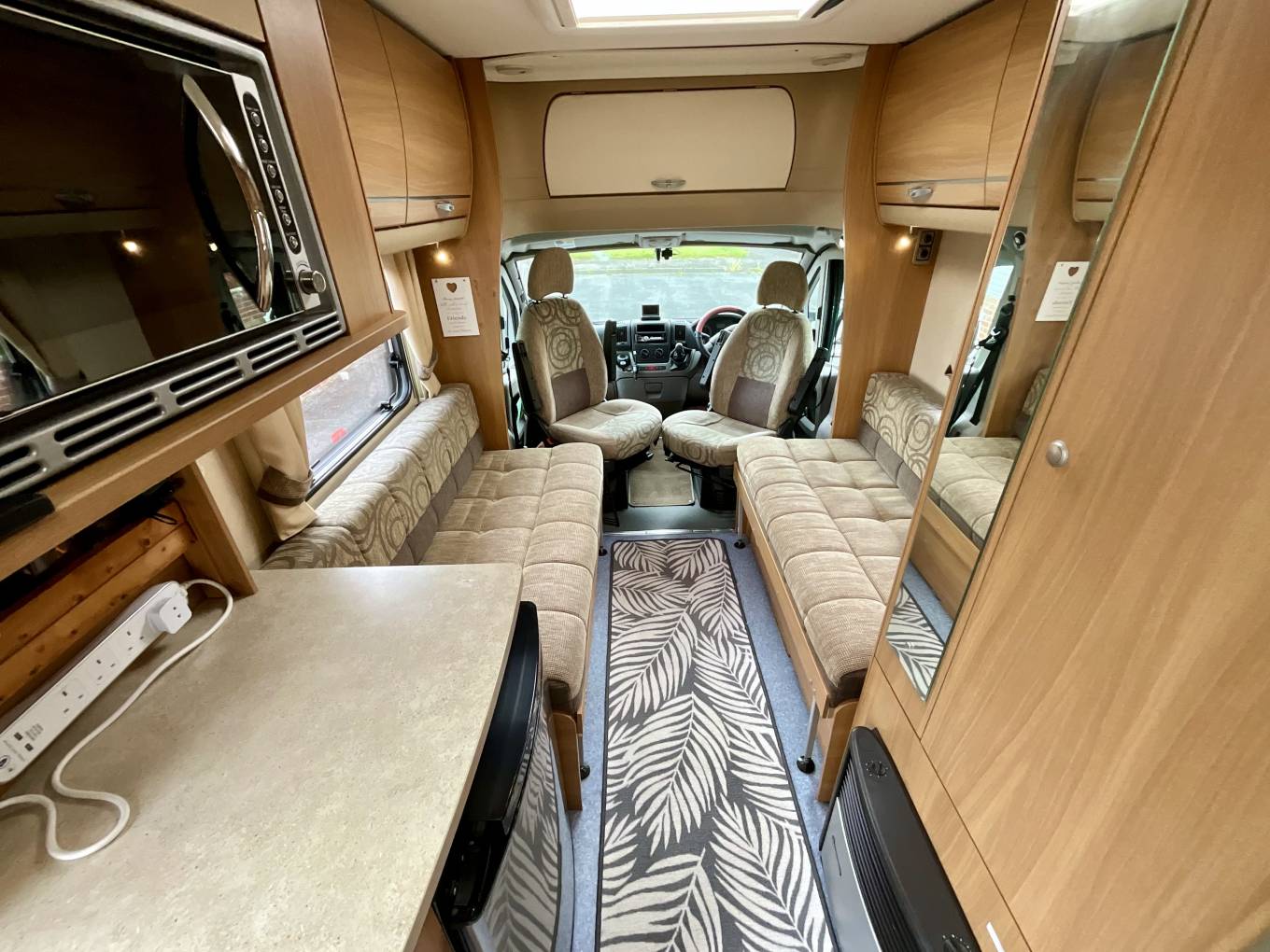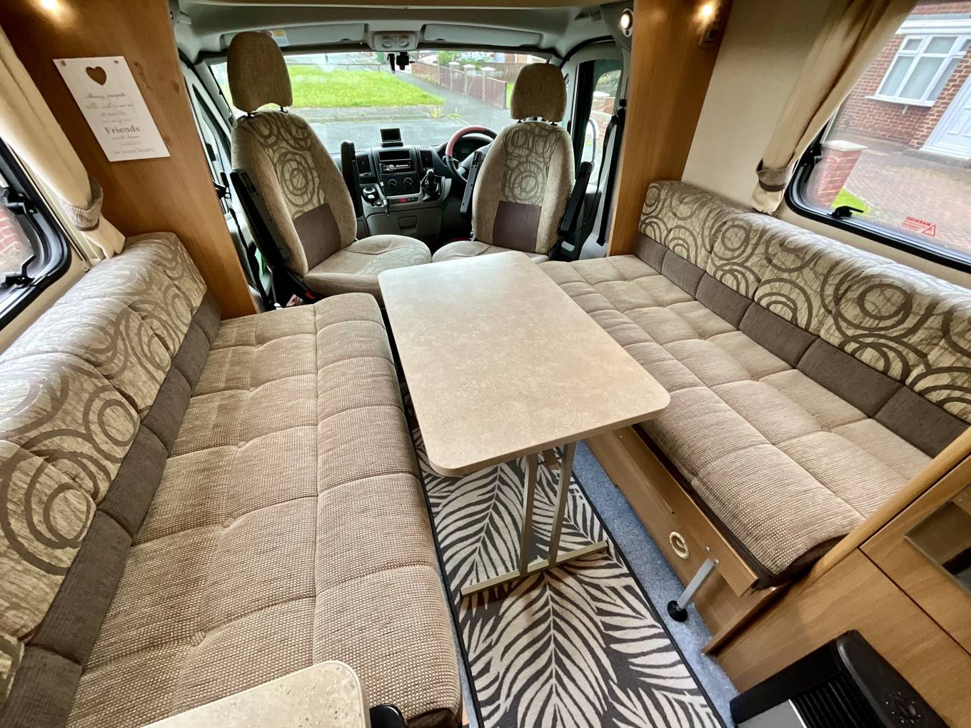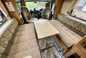 Although only 5.90 meters long it feels larger than its size inside with a spacious lounge area having enough room to entertain at least 6 people when the front seats swivelled round - the neutral upholstery gives it a very light and airy atmosphere in which to which to relax and watch the drop down 12v TV.