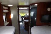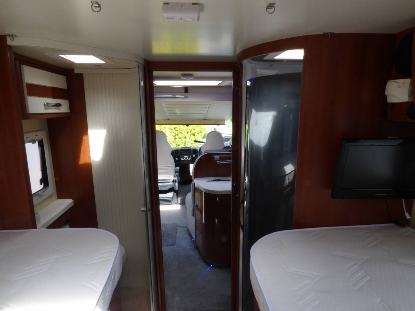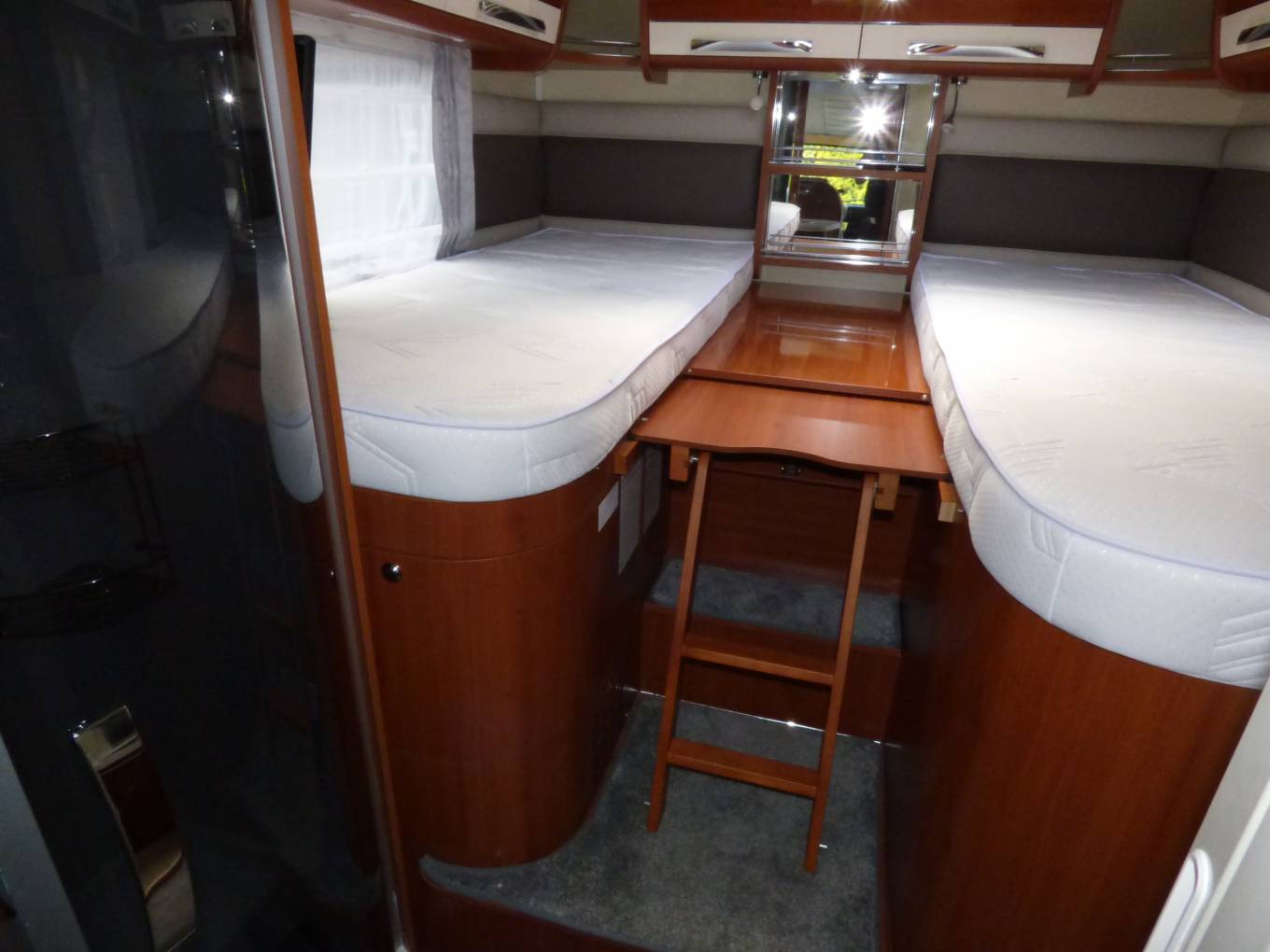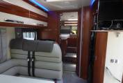 Typicl Italian flair has gone into the design and finish of this luxurious A class motorhome with leather throughout. A large dropdown double bed over the spacious cabin area and two large fixed singles in the rear bedroom area form the 4 berths. The rear singles can be made into a double with the addition of the matching mattress. These single beds sit over large wardrobe areas with lots of storage throughout the vehicle. The rear bedroom area has direct access to the large w.c. with vanity unit and sink and tambour style screen, opposite a large individual shower cubicle.