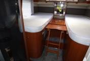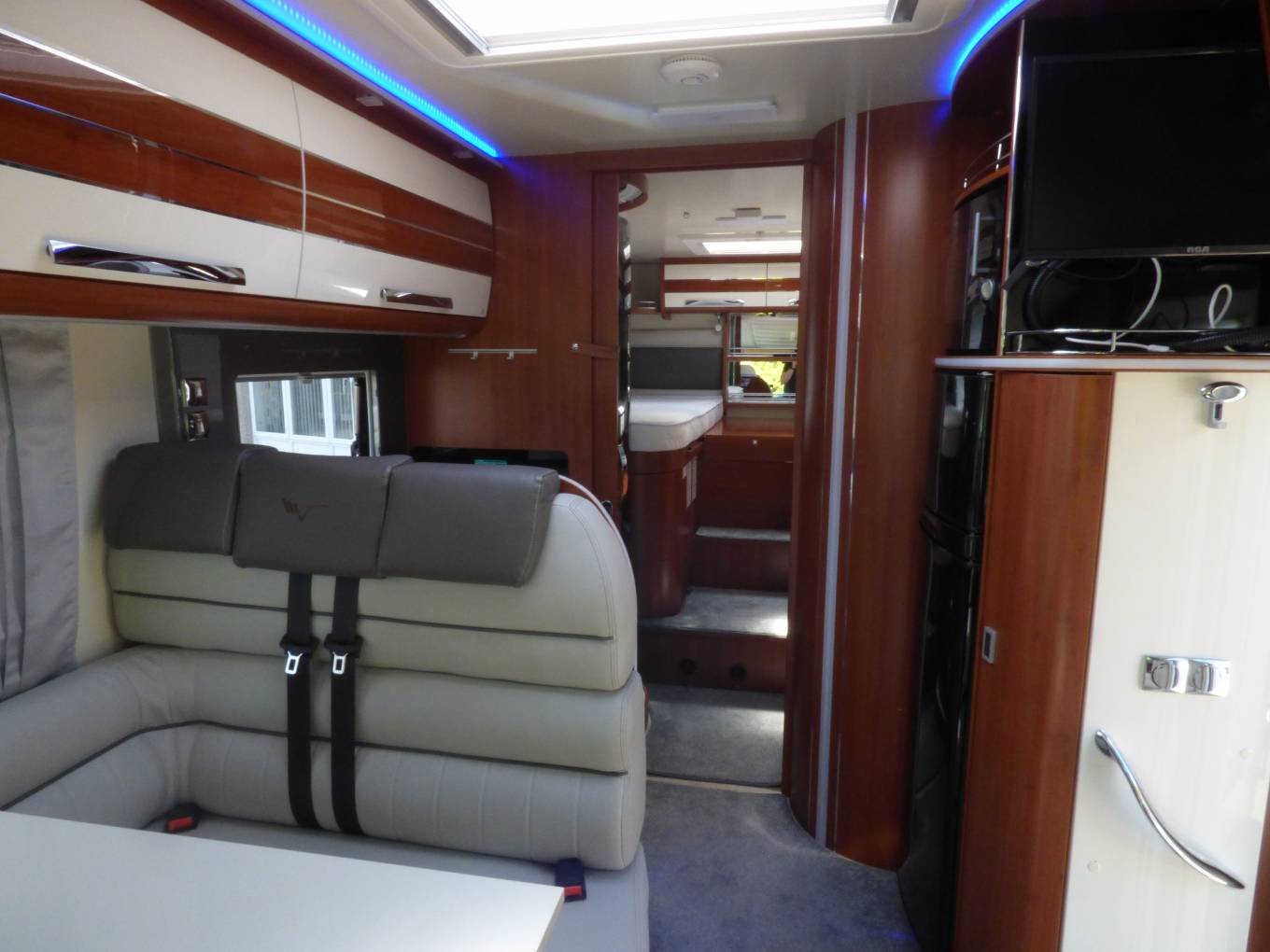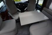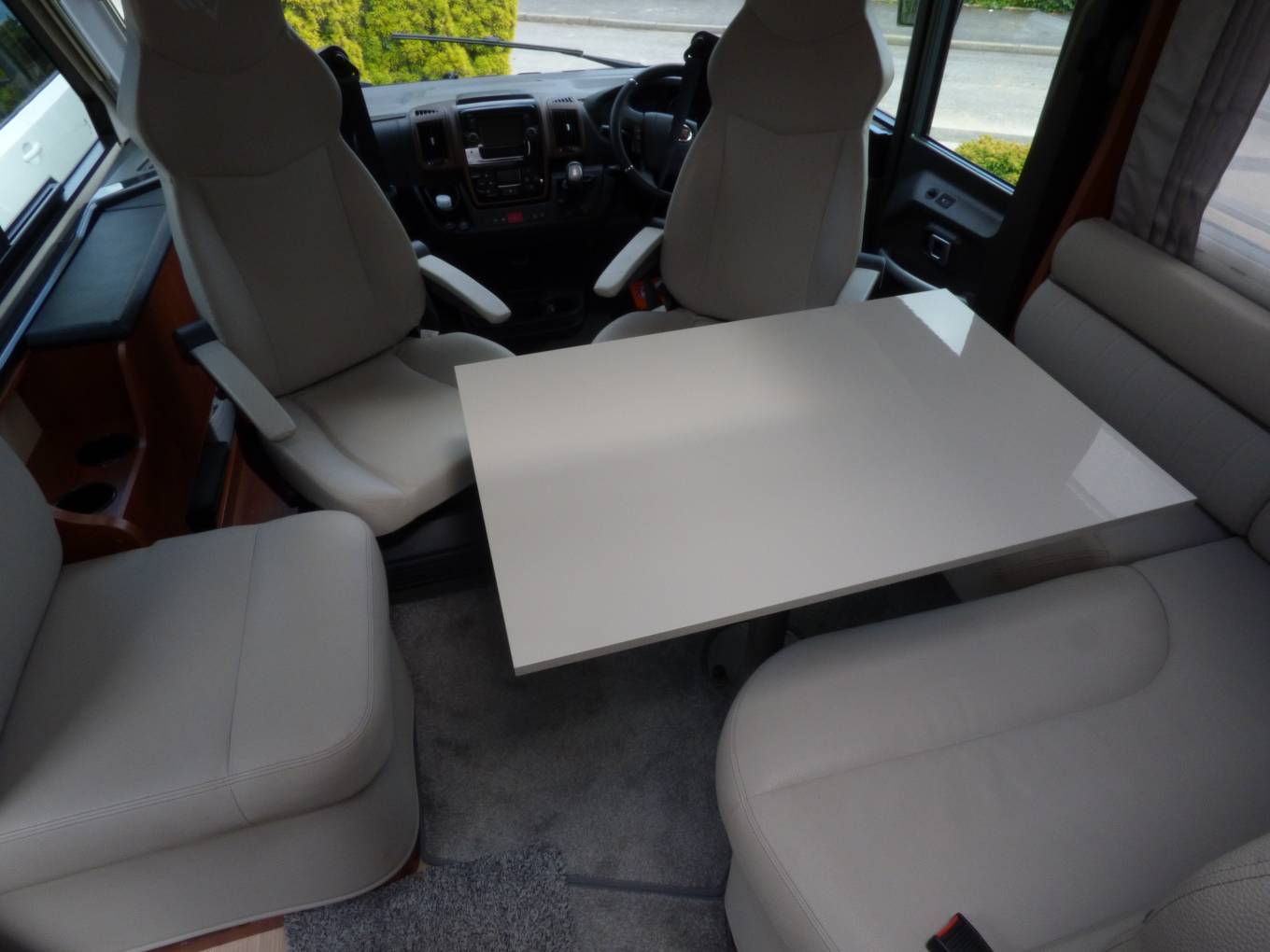Towards the front is a comfortable and roomy dinette/socialising area with seats for probably 7 people, the 2 front seats swivel towards the large table which has around it a side bench on either end and a forward facing seat with the 2 seatbelts.