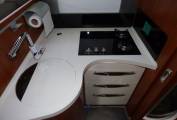 The kitchen area has a massive fridge and freezer compartment and combined oven/grill over. The sink and preparation area sits alongside the induction ring and two gas burners. There are many lockers and cupboards/drawers throughout the vehicle, beautifully finished in a rosewood effect with matching white veneer.