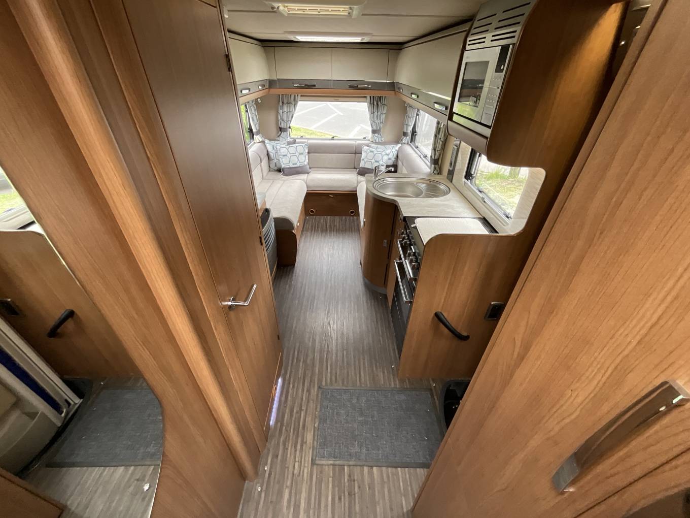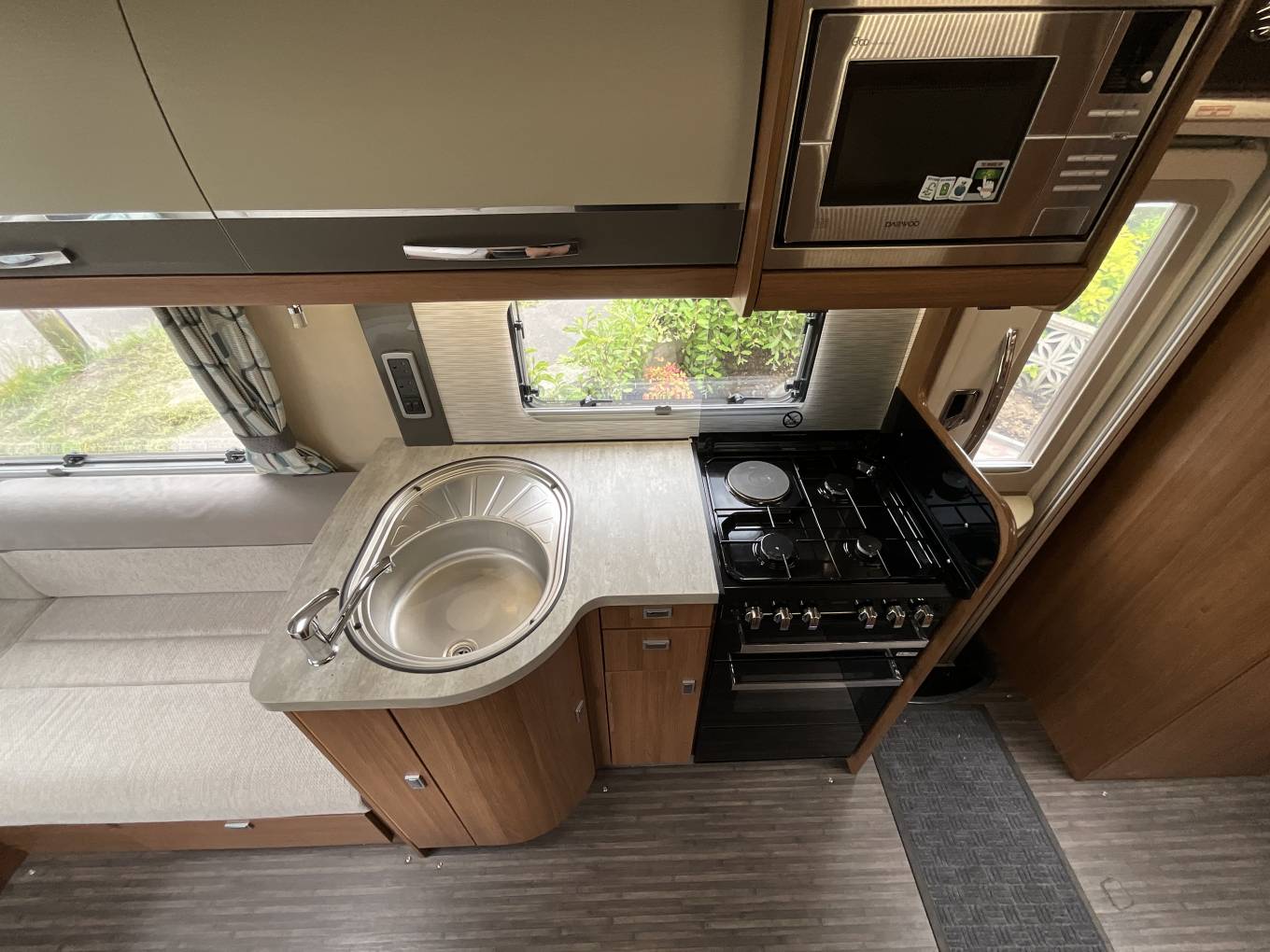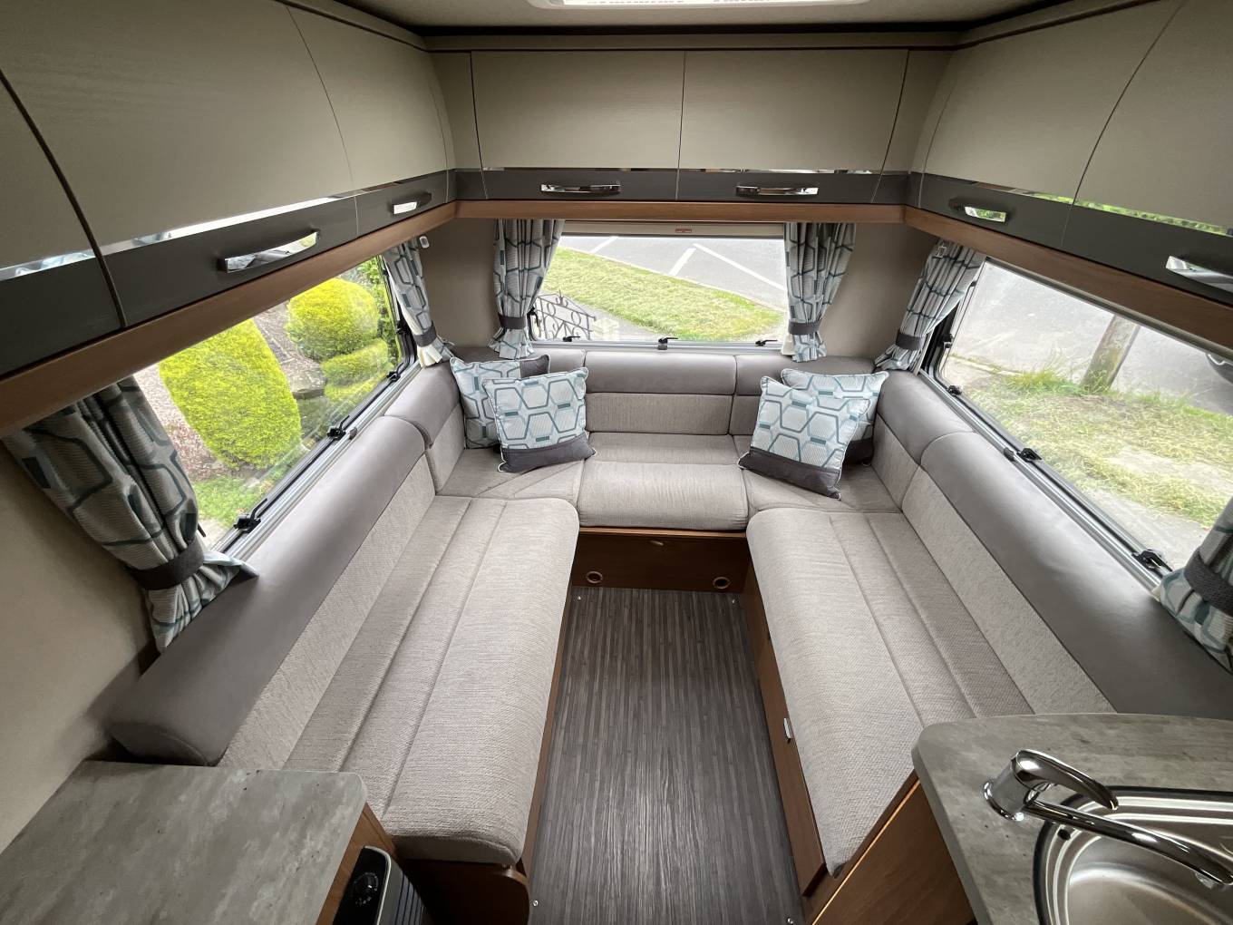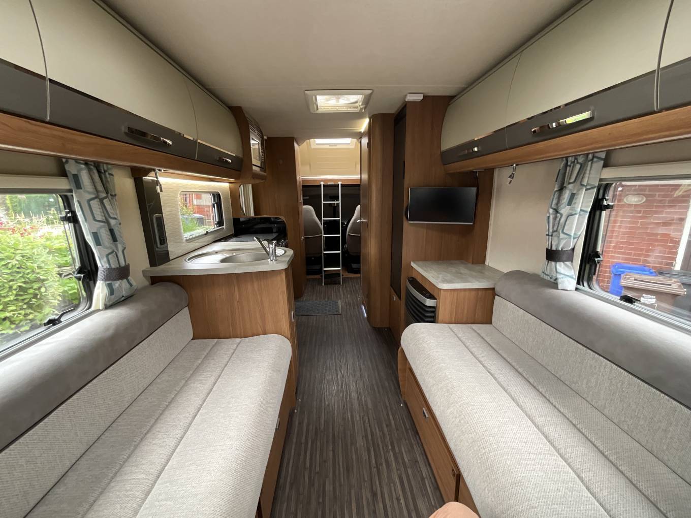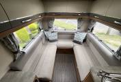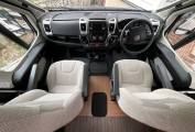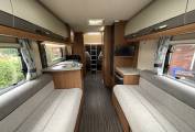Starting at the rear of this motorhome you will find a spacious U shaped lounge with unrivalled panoramic views through the triple aspect windows, flooding this area with natural light. This area includes a removable dining table, sideboard, TV and overhead lockers. As the night draw in, this can be easily converted into a large double bed or 2 single beds. Moving forward you will find the well equipped kitchen including a microwave, sink with mixer tap and drainer, 3 gas burner and 1 electric hot plate, oven and grill, large fridge with freezer compartment and ample storage. Adjacent to this is the well specced bathroom with cassette toilet, wash basin and separate shower. To the front you will find a wardrobe, some shelving and the cab area with 2 swivel seats. Finally, there is a comfortable over cab double bed completing this 4 berth motorhome.