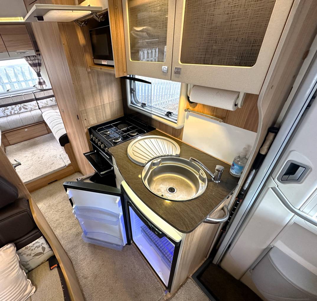 tap and drainer, microwave and three-way fridge with freezer compartment.