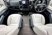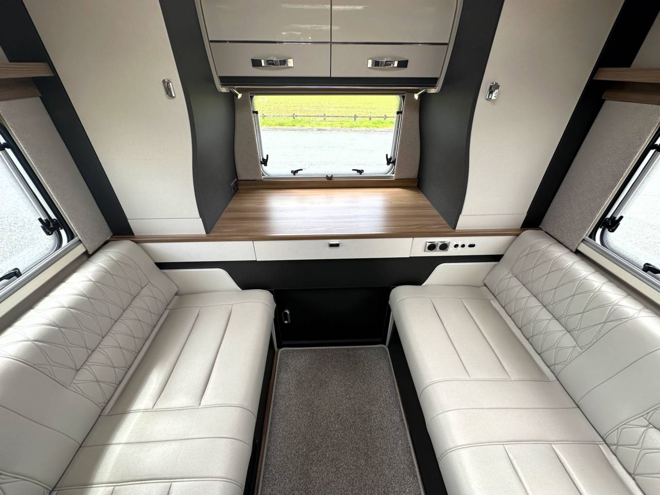 the motorhome, you will find the light & spacious front lounge with two long-facing side benches, an adjustable bi-fold table and two swivel captain seats, providing