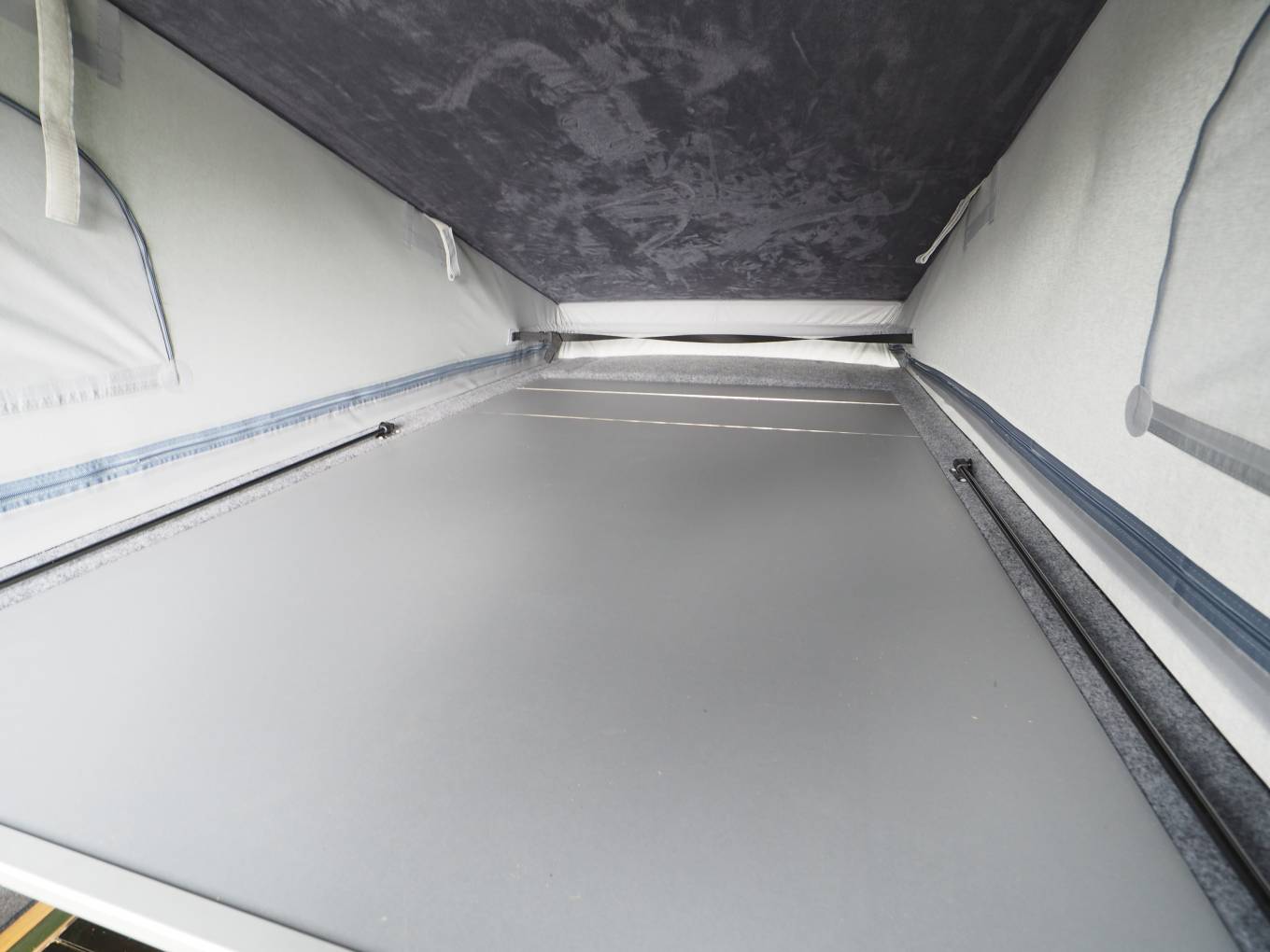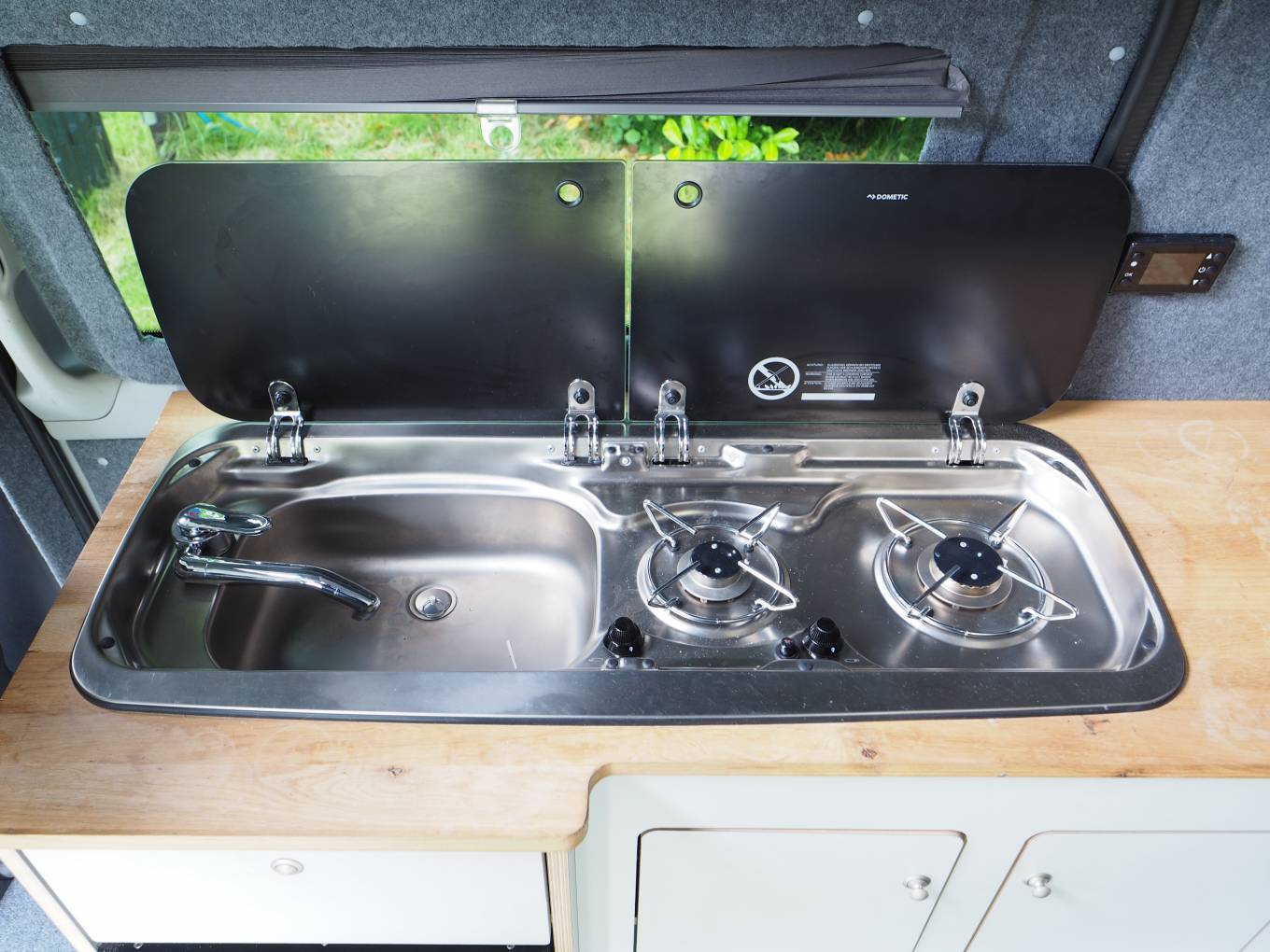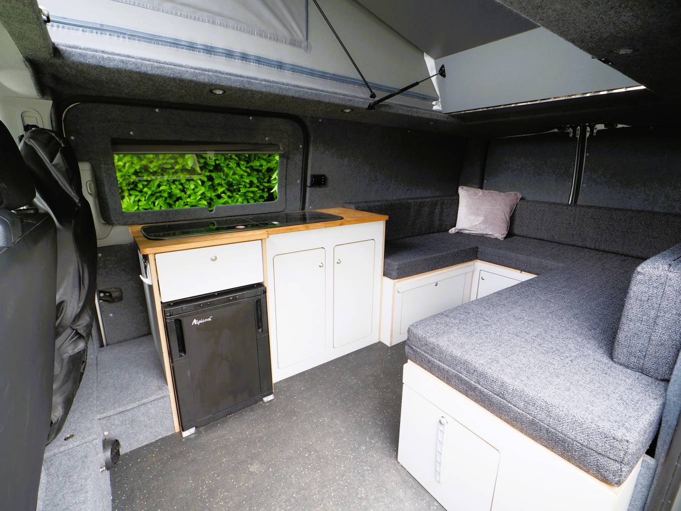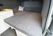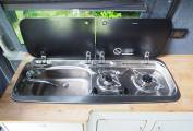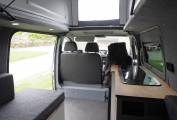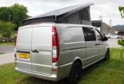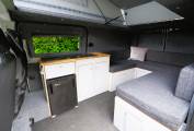 A comfortable yet compact van at only 5.3m long the layout includes a spacious U shaped rear lounge that converts to a large double bed. A pop top provides plenty of head room and comes with a bed board to provide an additional 2 berths. A two burner gas hob provides cooking facilities and there is a sink with tap as well as a 12v fridge with freezer box to keep your essential food and drink items cold. A diesel heater provides heating and there is 12v and 230v electric power from the leisure battery and electric hook up respectivley. Both 3 pin and USB sockets provide connection and there is a 2000w converter fitted. Lots of storage under the sofas and in the built-in cupboards. A porta potti toilet is included with cover and there is a pop up toilet tent included.