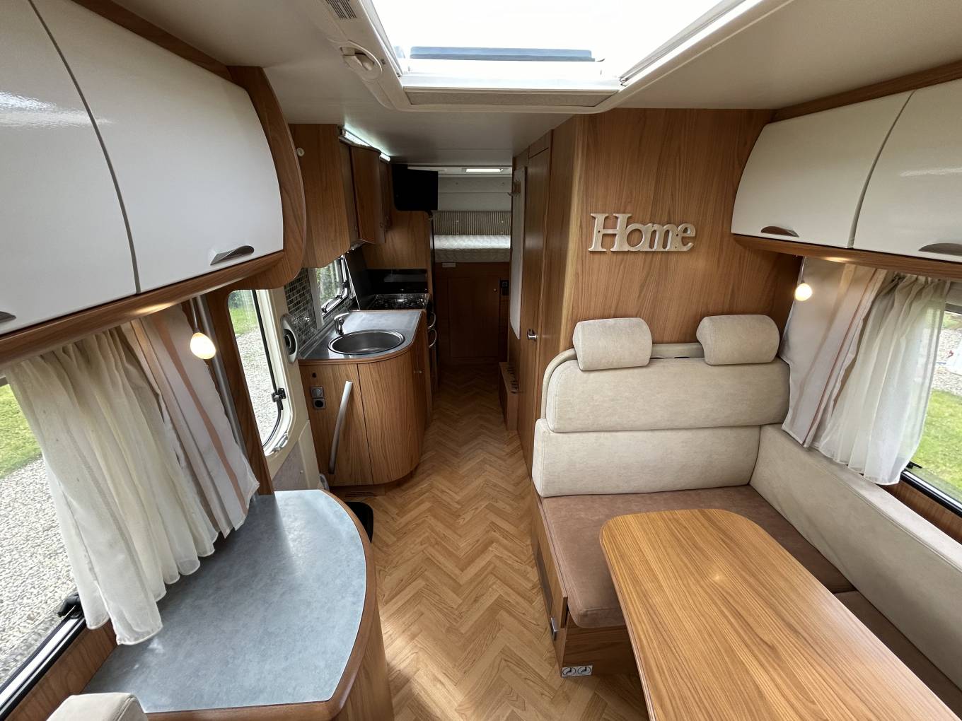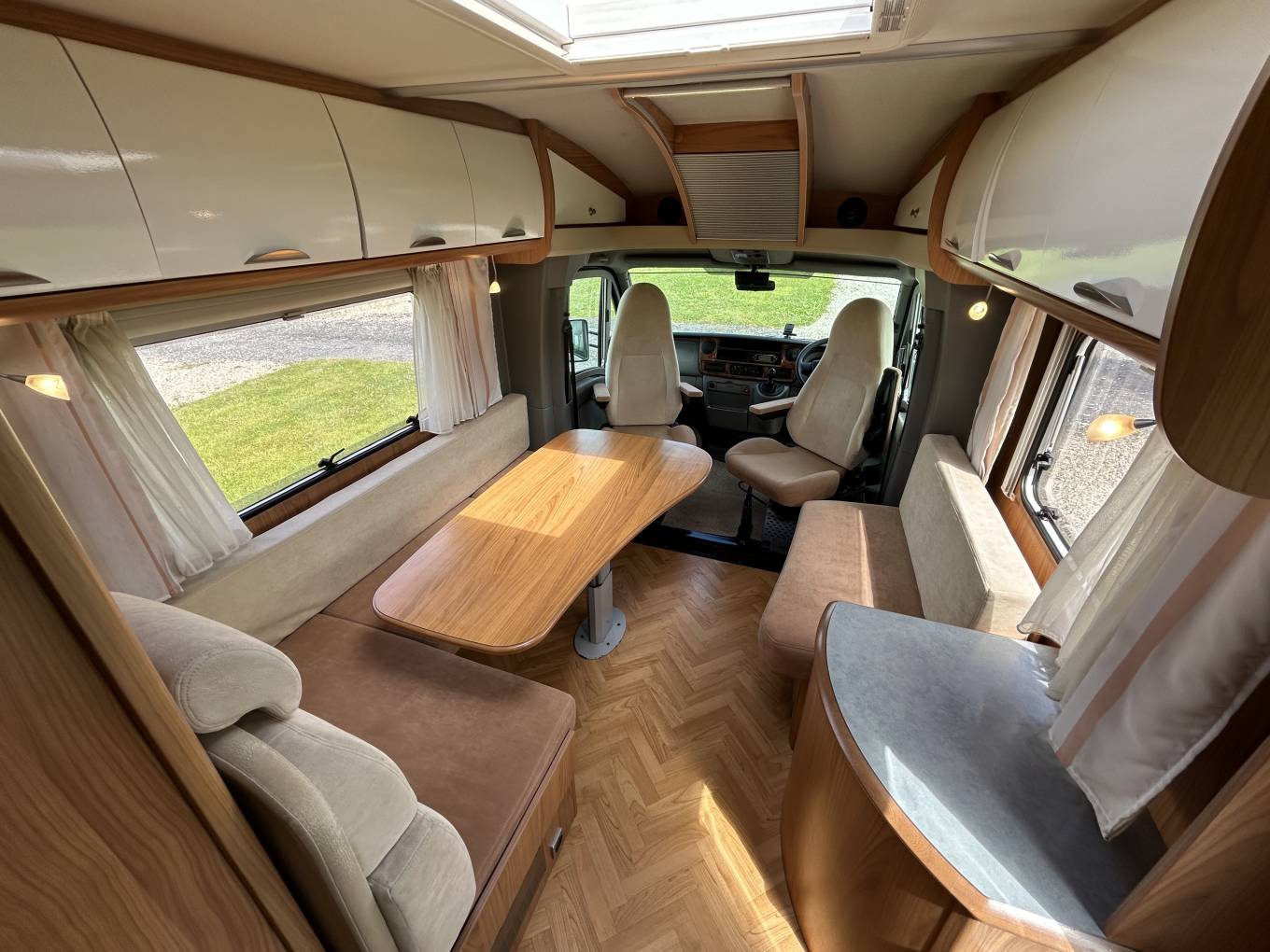 Behind the cab area, you have a beautiful bright centre dinette area that has an adjustable table to suit your preferences, with the side bench and the swivel cab seats you could easily sit up to 6 people in this area, The cab area is one that gives you everything you want to be comfy and enjoy the drive when you are travelling to and from your next adventure, you also get plenty of natural light and this is something you notice throughout the motorhome.