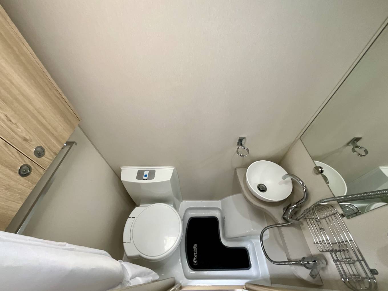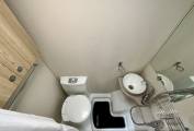 The washroom comes with a sizeable shower space, storage unit, washbasin and toilet with cassette.