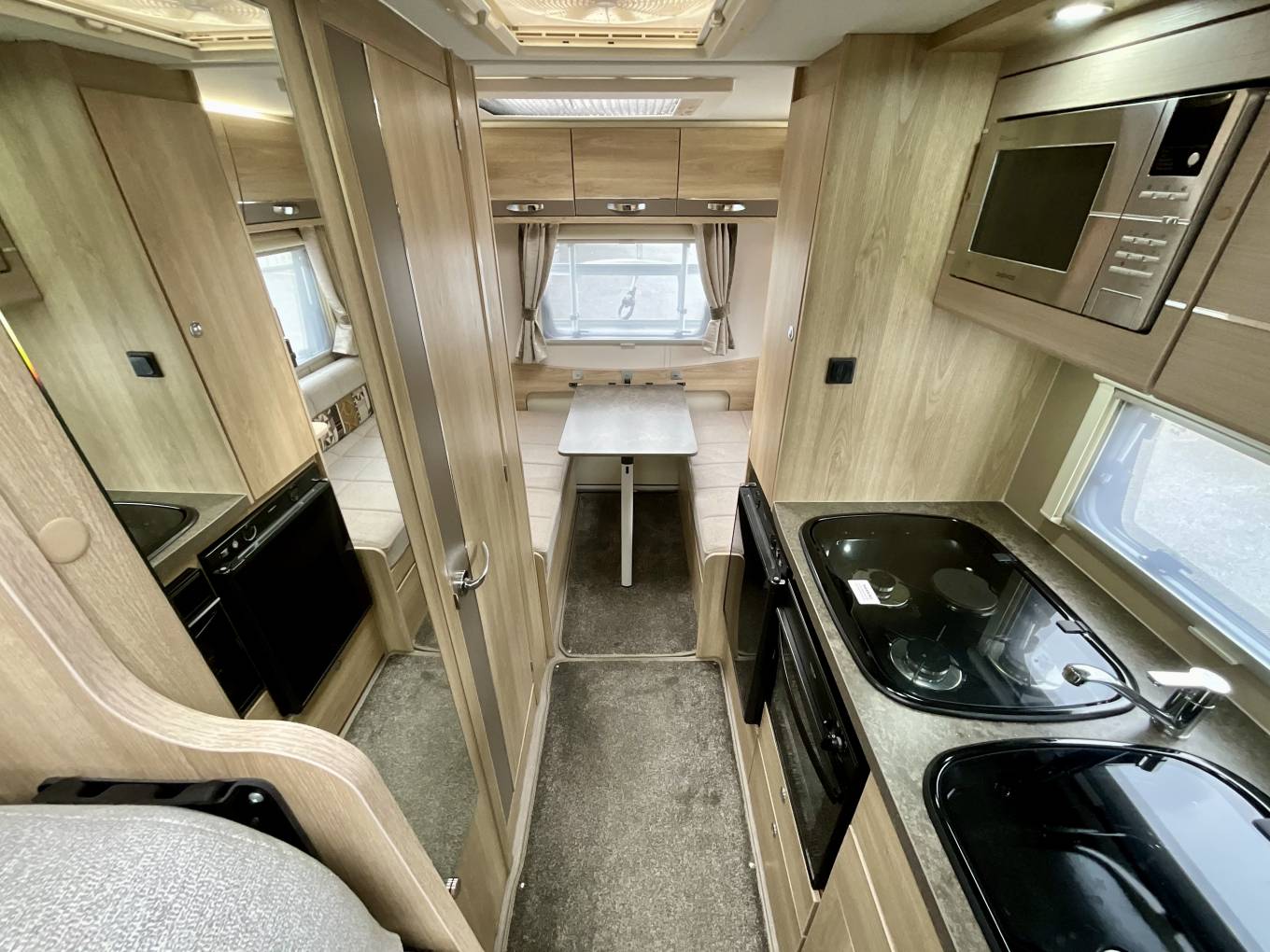 The kitchen comes fully equipped with a fridge/freezer, gas hobs, electric hotplate, tap and sink, fold out preparation space and oven with grill, along with plenty of storage for crockery, condiments and cutlery.