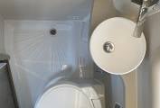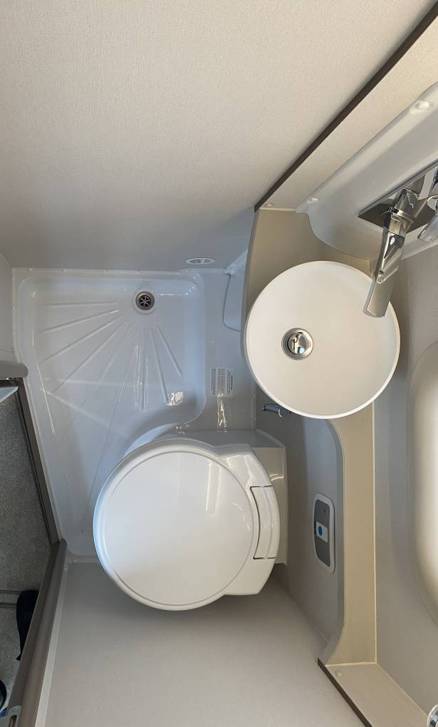 compartment. The bright spacious washroom has a cassette toilet, vanity sink