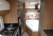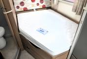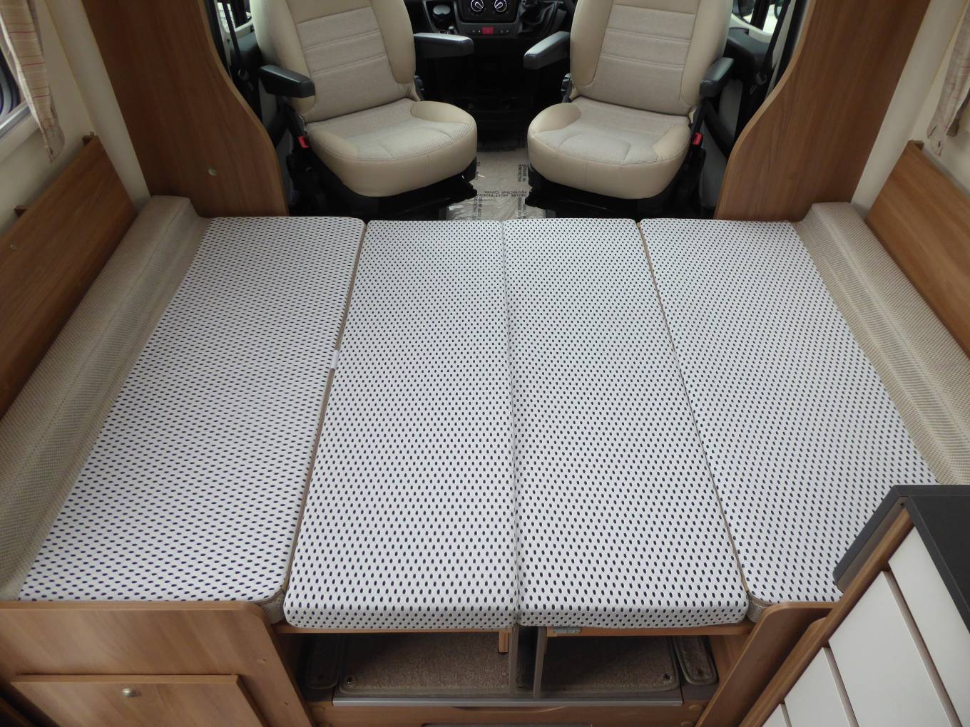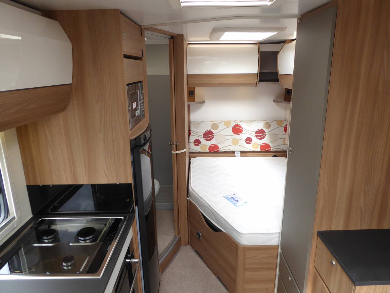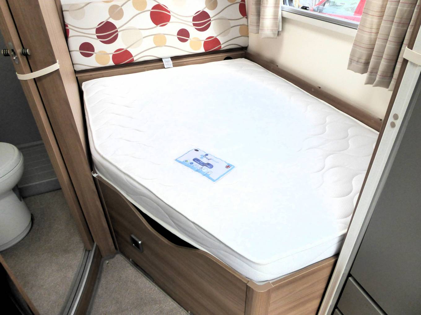 At the rear is the fixed, French bed, with additional storage below and surrounding. A nice shelf allows you to have a cup of tea in bed and watch TV!
