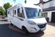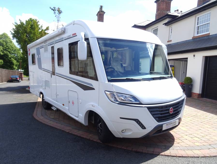 Pilote G740 Evidence luxury A Class 2021motorhome for sale. Only 11600 miles, one owner and is presented in beautiful condition. On a Fiat Ducato 3650kg chassis with a 9-speed automatic transmission providing an effortless and comfortable driving experience. The living quarters include a rear bedroom with island bed, which is complimented by an ensuite washroom and separate shower. The spacious front lounge area has twin swivel chairs, LED lighting and TV. A drop-down bed over the cab area provides sleeping places for 2 persons. A mid ship kitchen is well equipped and includes a large 3-way fridge freezer. Other features include solar panel, DAB radio, motorhome WIFI, cab air con, cruise control, 4 travel seats, awning, electric step, daytime running lights, reverse camera, large rear garage area, belly locker for storage and Truma combi boiler heater and hot water system. Full-service history.